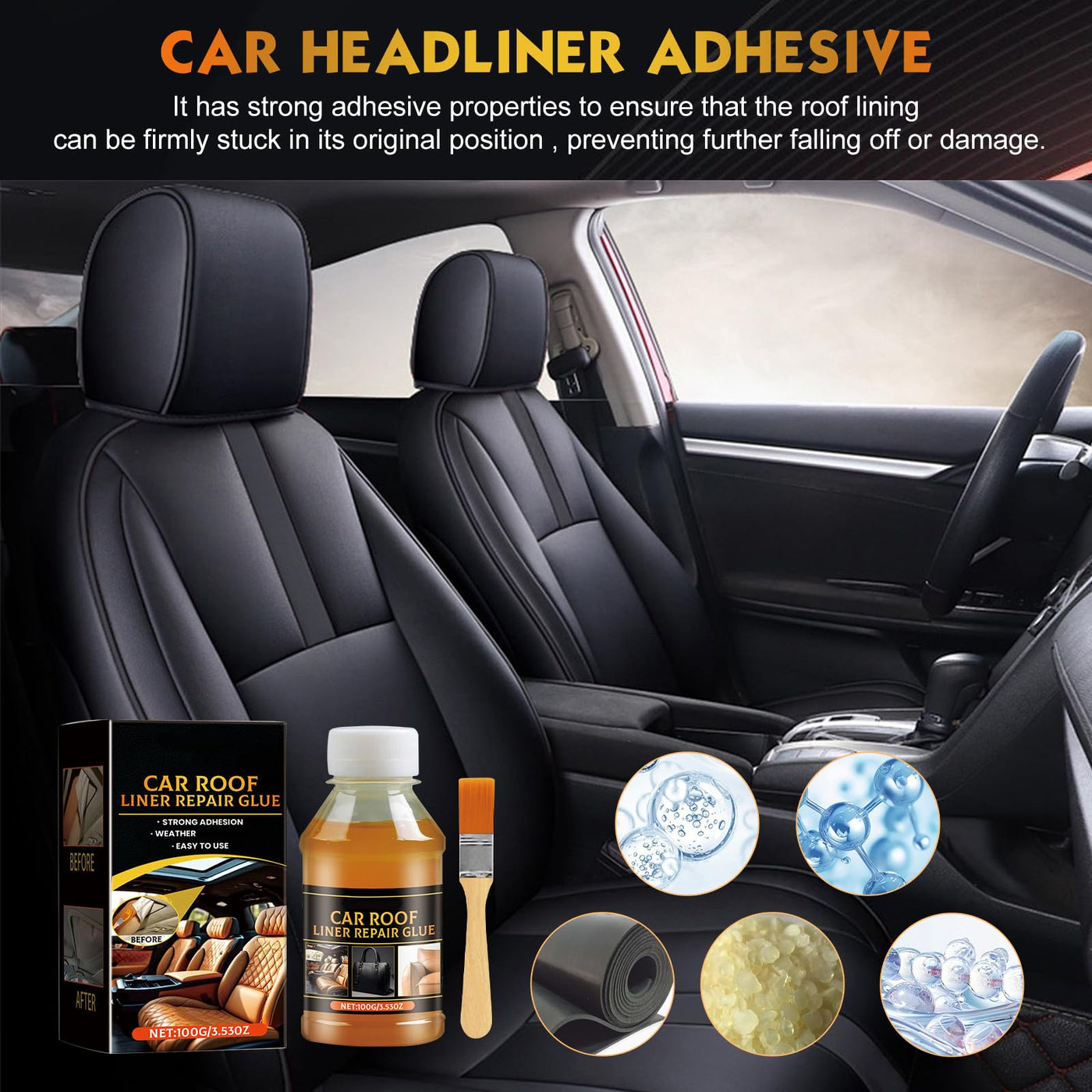 ------------------------------------Welcome to our shop----------------------------------- ABOUT THIS PRODUCT: Product Name: Headliner Repair Glue Net Weight: 100 ml PACKAGE INCLUDE: *2PCS Repair Glue *2PCS Brushes