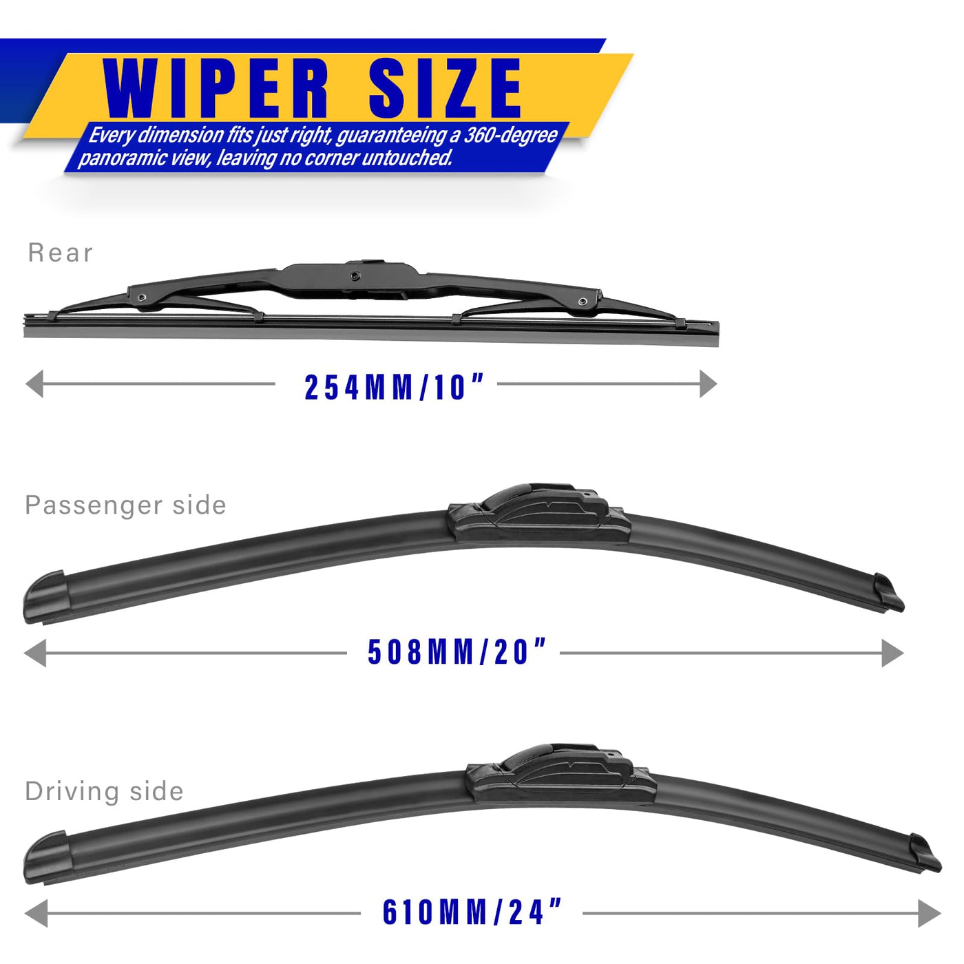 Q: What sizes are included in this wiper blade set?A: The set includes three wiper blades in sizes 24 inches, 20 inches, and 10 inches, suitable for the front windshield of your GMC Acadia.