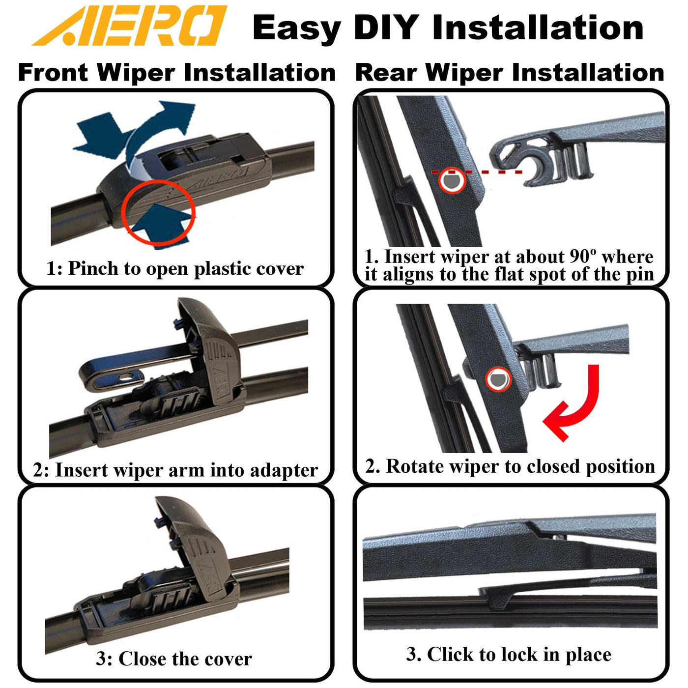 Q: How do I install AERO wipers?A: AERO wipers feature a tool-less installation design, making it quick and easy to install. Simply follow the included instructions to mount the wipers onto your vehicle's wiper arms.