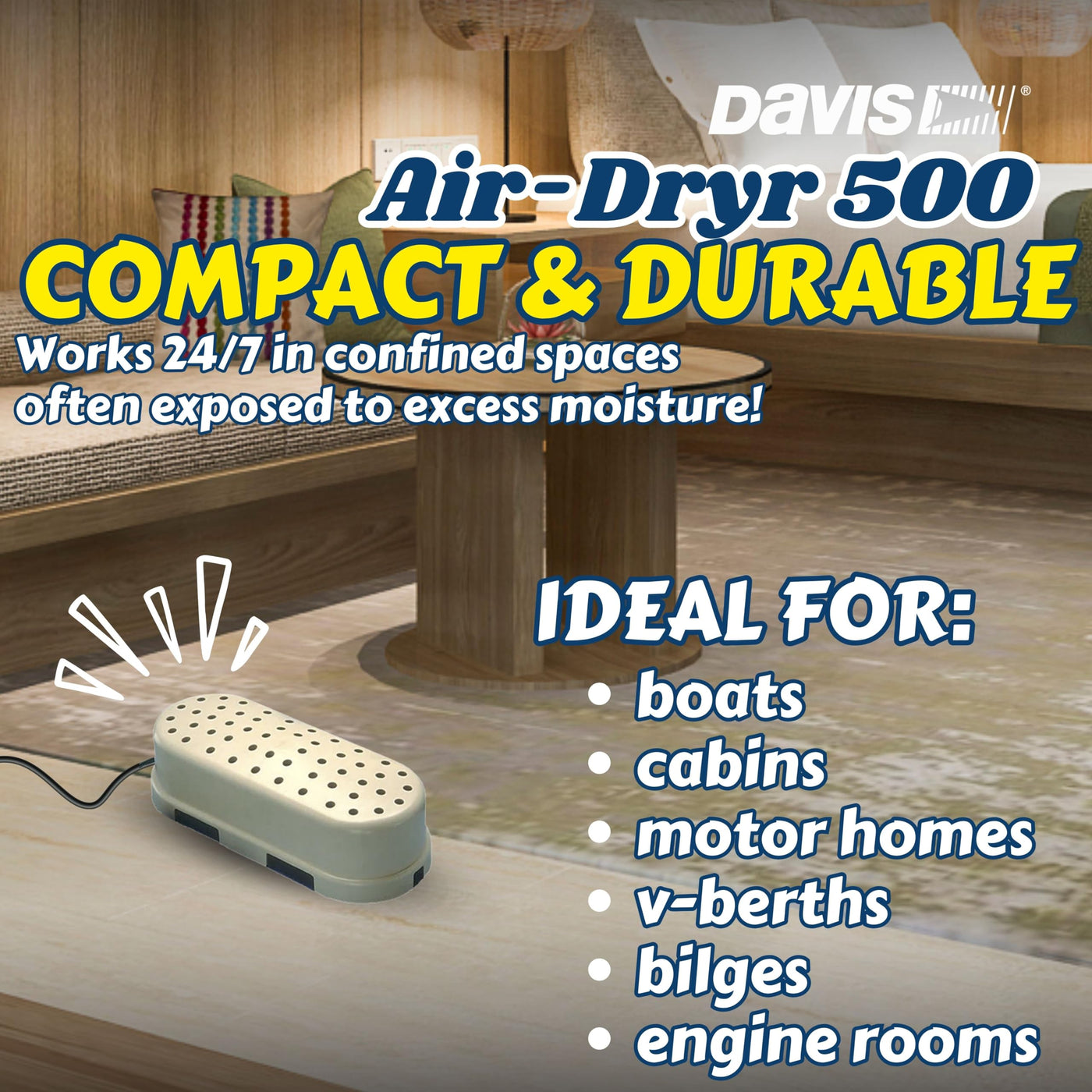 Q: What is the maximum airflow capacity of the Davis Air Dryer 500?A: The Davis Air Dryer 500 has a maximum airflow capacity suitable for drying areas up to 500 cubic feet, making it ideal for various applications including boating and other outdoor activities.