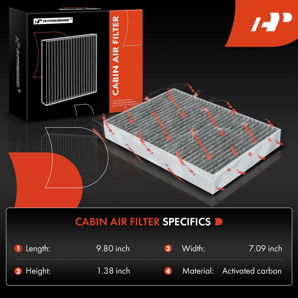 Q: What are the dimensions of the A-Premium Cabin Air Filter?A: The dimensions of the A-Premium Cabin Air Filter are approximately 9.80 inches in length, 7.09 inches in width, and 1.38 inches in height.