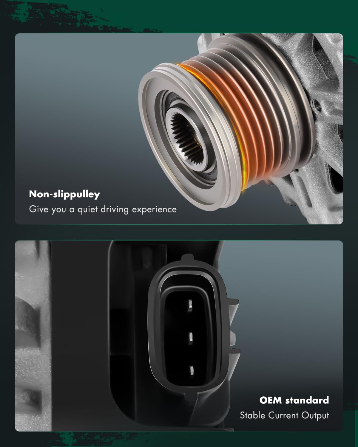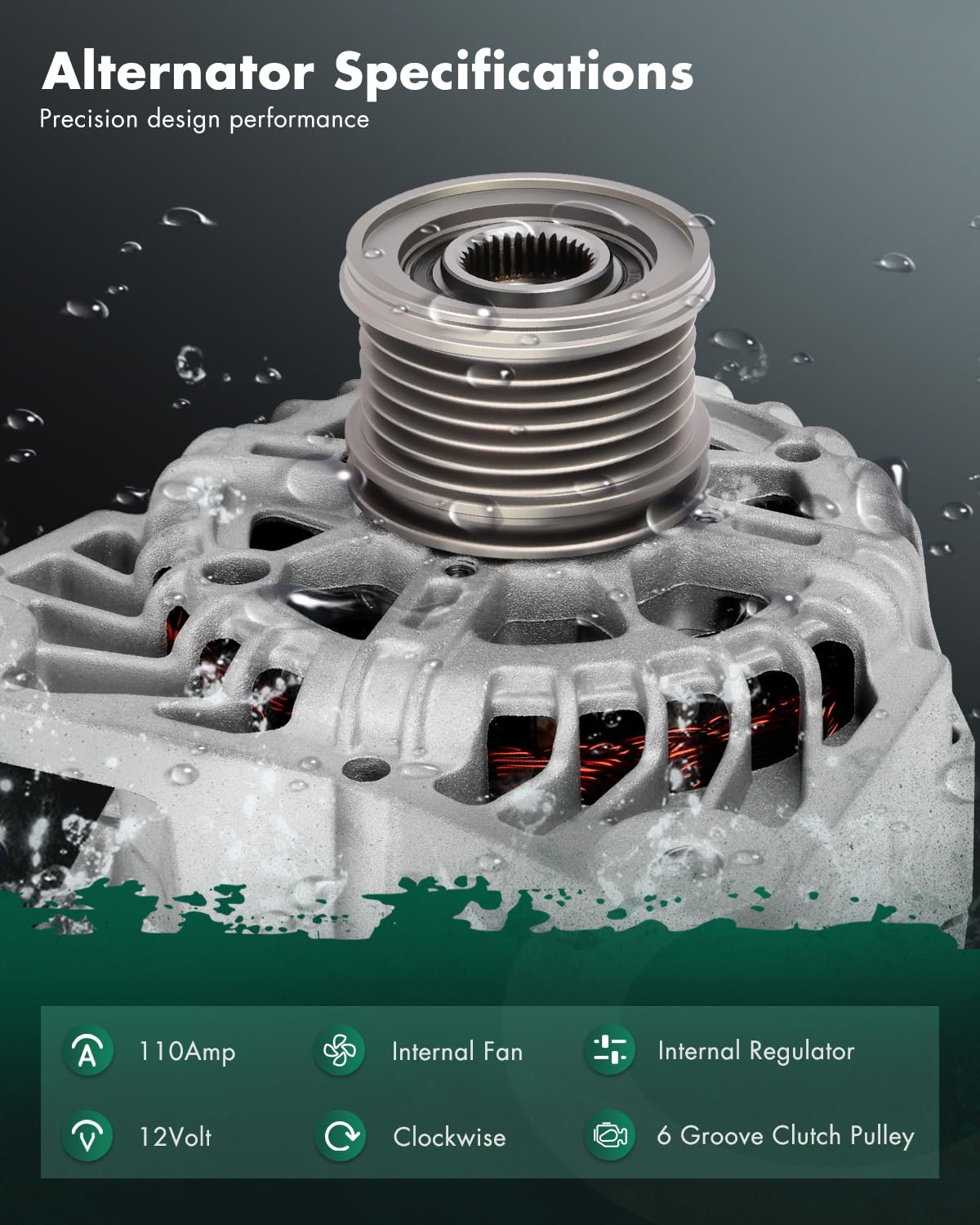 ?Alternator Fitment?- Automotive new alternator replacement for Nissan for Sentra 1.8L 2013,for Nissan for Sentra 1.8L 2014,for Nissan for Sentra 1.8L 2015,for Nissan for Sentra 1.8L 2016,for Nissan for Sentra 1.8L 2017,for Nissan for Sentra 1.8L 2018,for Nissan for Sentra 1.8L 2019 | ?High-Performance Specifications? - Engineered with Voltage: 12V; Amperage: 110Amp; Rotation: CW (Clockwise); Regulator: IR (Internal Regulator) ; Fan: IF (Internal Fan); Grooves: 6 Groove Clutch Pulley; Condition: New, high output alternator is compact and lightweight, fully compatible with the electronic system of your vehicle, this automotive replacement alternator delivers reliable power for your car, it