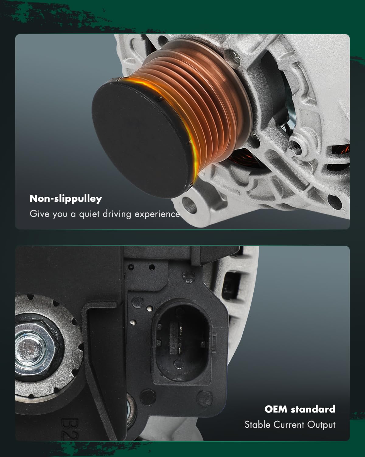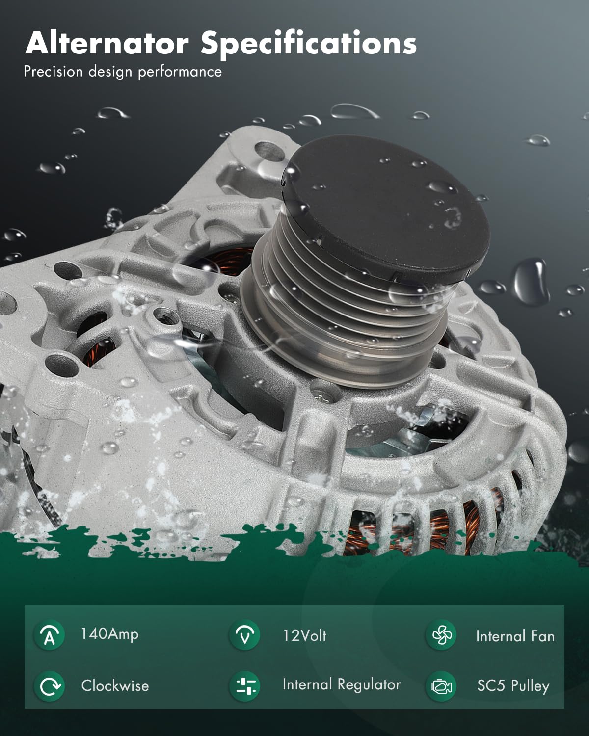 ?Alternator Fitment?- Automotive new alternator replacement for Volkswagen for Passat 2.0L 2004,for Volkswagen for Passat 2.0L 2005 | ?High-Performance Specifications? - Engineered with Voltage: 12V; Amperage: 140Amp; Rotation: CW (Clockwise); Regulator: IR (Internal Regulator) ; Fan: IF (Internal Fan); Grooves: SC5 Pulley Class; Condition: New, high output alternator is compact and lightweight, fully compatible with the electronic system of your vehicle, this automotive replacement alternator delivers reliable power for your car, it