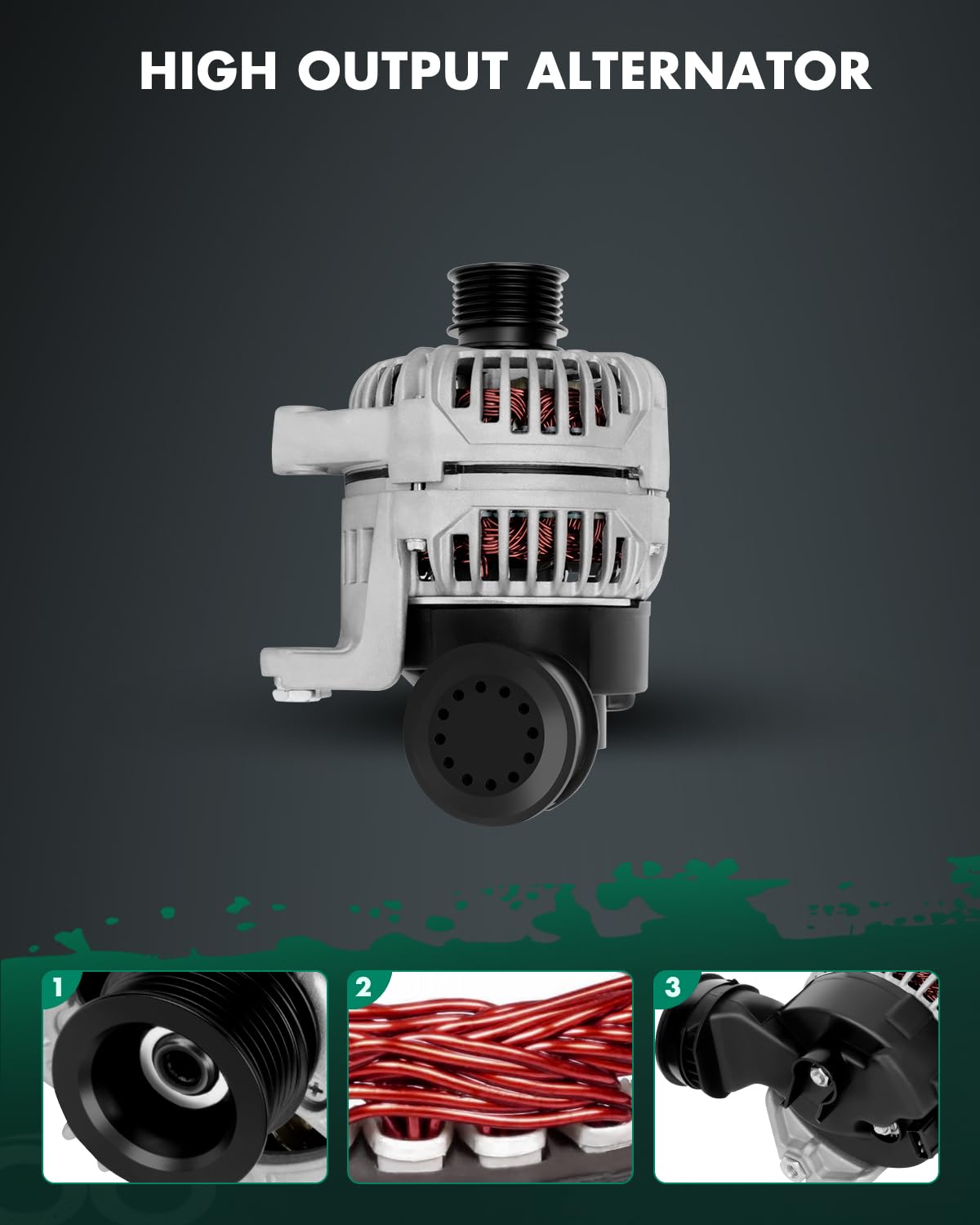 ?Alternator Fitment?- Automotive new alternator replacement for BMW for 323Ci 2000 ,for BMW for 323i 2000 ,for BMW for 325Ci 2001-2006,for BMW for 325i 2001-2005,for BMW for 325xi 2001-2005,for BMW for 328Ci 2000 ,for BMW for 328i 2000 ,for BMW for 330Ci 2001-2006,for BMW for 330i 2001-2005,for BMW for 330xi 2001-2006,for BMW for 525i 2001-2003,for BMW for 528i 1997-2000,for BMW for 530i 2001-2003,for BMW for X5 2001-2006,for BMW for Z3 1997-2002 | ?High-Performance Specifications? - Engineered with Voltage: 12V; Amperage: 120Amp; Rotation: CW (Clockwise); Regulator: IR (Internal Regulator) ; Fan: IF (Internal Fan); Grooves: 6-Groove Pulley; Condition: New, high output alternator is compact and lightweight, fully compatible with the electronic system of your vehicle, this automotive replacement alternator delivers reliable power for your car, it