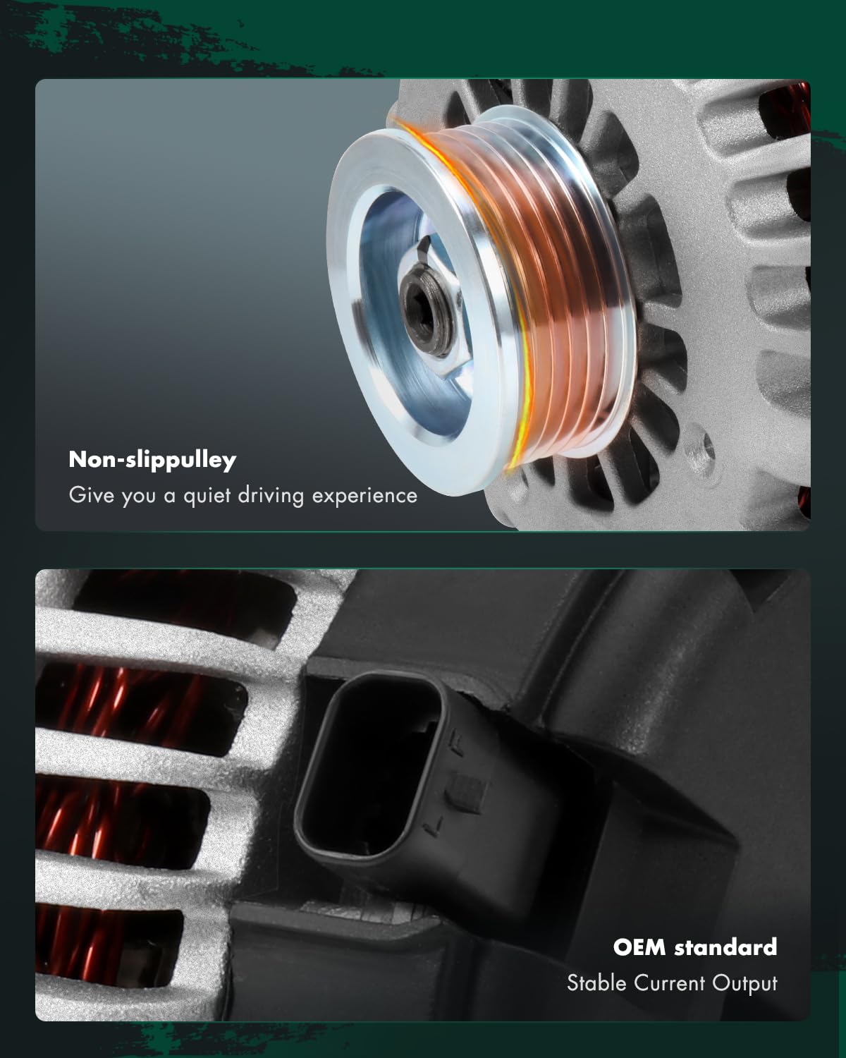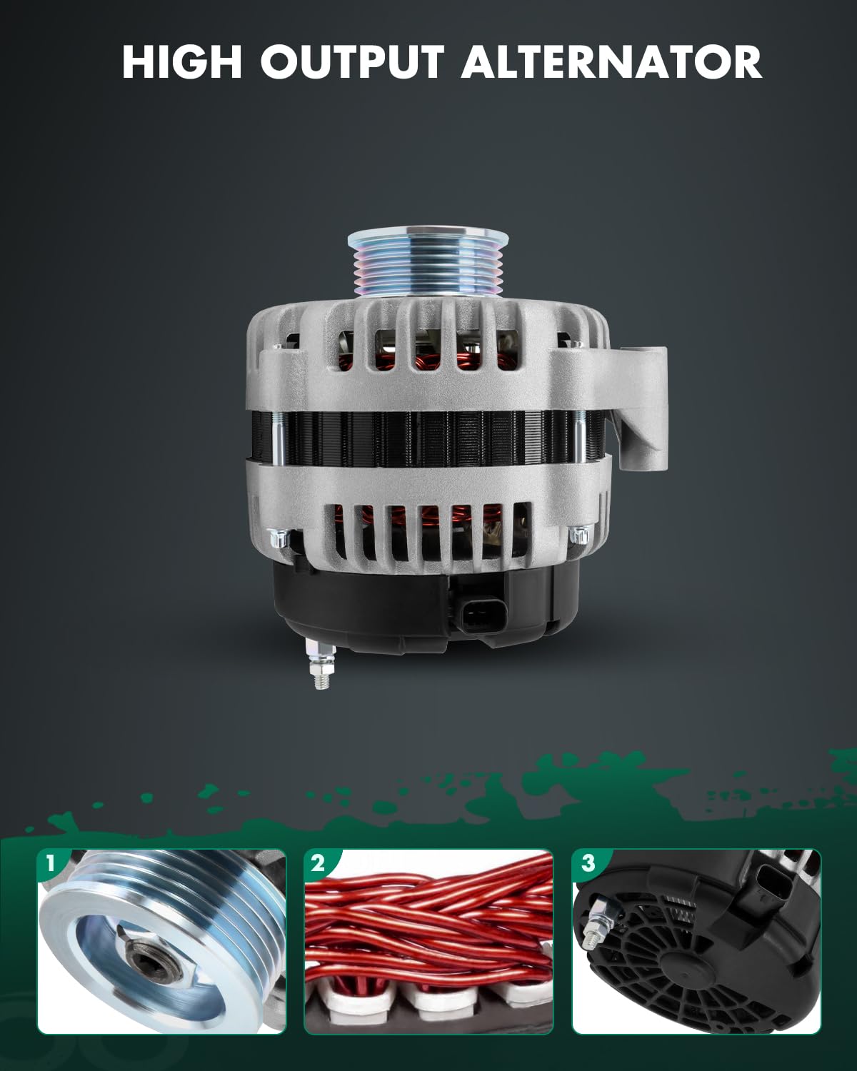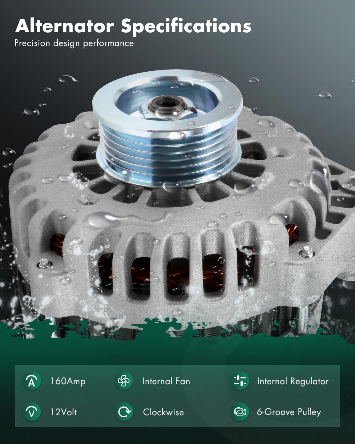 FITMENT - Alternator for Cadillac Escalade ESV 2007-2014 6.2L/6.2L for Chevrolet Avalanche 2007-2013 5.3L Silverado 1500 2007-2013 4.3L/4.8L/ 5.3L/6.0L for GMC Sierra 1500 2007-2013 4.3L/4.8L/5.3L/6.0L Sierra Denali 2007 6.0L/6.2L Yukon 2007-2008 6.2L/4.8L For Hummer H2 2008-2009 6.2L | SPECIFICATION - 160 Amp/12 Volt, CW, 6-Groove Pulley,DR44G Series IR/IF | REPLACEMENT - 15093928, 15857608, 15905871, 25877026, GM 15093928, 15857608, 15905871, 25877026 | COMPONENTS - Longer life of the alternator through the use of premium brushes and other critical | TEST - Rigorous and accelerated cycling tests to ensure product service, quality and durability