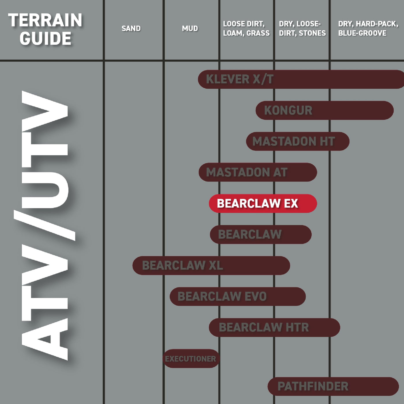 The Kenda Bearclaw EX K573 is a robust and versatile tire designed for All-Terrain Vehicles (ATVs), Utility-Task Vehicles (UTVs), and Side-by-Side (SxS) vehicles. Built for aggressive riding in mixed terrains, this tire combines durability, performance, and protection. It features ramp edge center knobs for reduced rolling resistance, combined with the 6-ply construction, ensuring extra toughness, and the unique tread design, which makes it the ideal tire for tackling challenging off-road conditions. The Bearclaw EX balances strength and efficiency, making it a reliable choice for utility and recreational riders alike.
