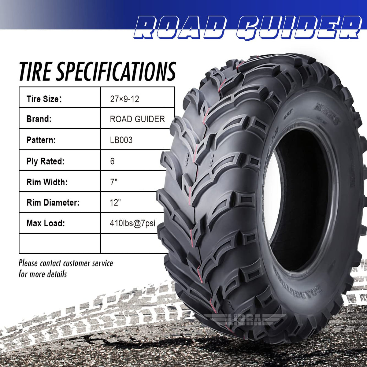 2 front tires replacement, fit for a variety of 2 or 4 wheel drive ATV applications . Dynamic tread patter provides exceptional acceleration and traction. Versatile tread patterns perform well in soft to hard pack conditions . Lug design provides better braking control. Heavy 6 ply rated construction resists punctures and abrasions. Tires only, wheels not includedTire SpecificationsTire Size: 27x9-12Brand: Road GuiderTread Pattern: LB003Ply Rated: 6Rim Width: 7Max Load: 410lbs@7psiPlease note: fitment guide is for reference only and does not guarantee the tire will fit your specific model. Please check your owner's manual to ensure proper fitment.
