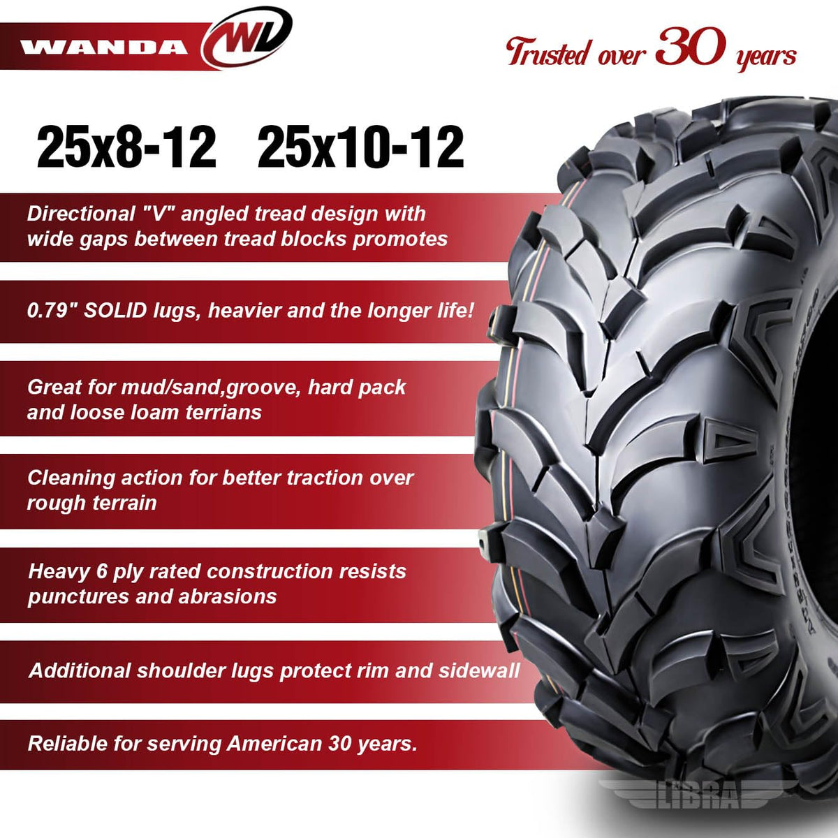 Full set (2 front and 2 rear) for complete replacement Original equipment tread design, fitments for a variety of 2 and 4 wheel drive ATV applications Directional ''V'' angled tread design with wide gaps between tread blocks promotes. Cleaning action for better traction over rough terrain. Additional shoulder lugs protect rim and sidewall Heavy 6 ply rated nylon construction resists punctures and abrasionsTire SpecificationsTireSize: 25x8-12Brand: WANDAPattern: P341Ply Rated: 6Tread Depth: 0.79''Rim Width: 6.5''Max Load: 340lbs@7psiLoad Speed Index: 43JTire SpecificationsTireSize: 25x10-12Brand: WANDAPattern: P341Ply Rated: 6Tread Depth: 0.79''Rim Width: 8''Max Load: 420lbs@7psiLoad Speed Index: 50J