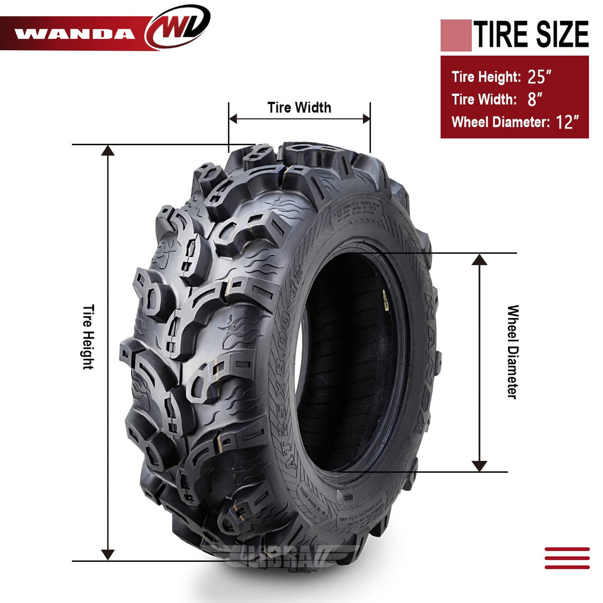 Aggressive, ultra deep self cleaning tread design for superior mud traction. Premium all terrain/mud design for utility class ATV's. Shoulder lugs for added traction and improved appearance. Riding cleat for smoother trail riding. Heavy 6 ply rated nylon construction resists punctures and abrasions. fitments for a variety of 2 or 4 wheel drive ATV applications. Tread depth: 1.03'' vs other similar pattern tires: 0.5'' or lessTire SpecificationsTire Size: 25x8-12Brand: WANDATread Pattern: P375Ply Rated: 6Tread Depth: 1.03Rim Width: 6.5Max Load: 340lbs@7psiLoad Index: 43Speed Rating: JPlease note: fitment guide is for reference only and does not guarantee the tire will fit your specific model. Please check your owner's manual to ensure proper fitment.