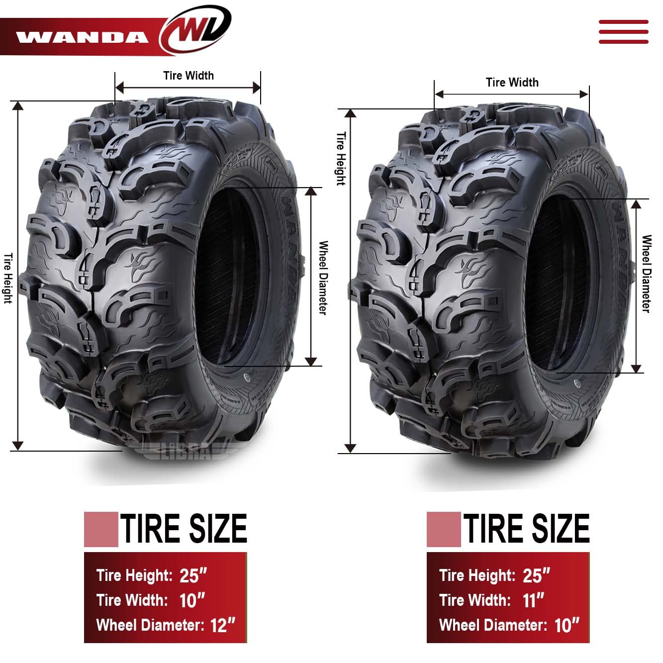 Aggressive, 1.09'' ultra deep self cleaning tread design for superior mud traction, Premium all terrain/mud design for utility class ATV's. Shoulder lugs for added traction and improved appearance. Riding cleat for smoother trail riding. Heavy 6 ply rated nylon construction resists punctures and abrasions. Full set (2 front+4 rear) for complete replacement. Tires only, wheels not includedTire SpecificationsTire Size: 25x10x12Brand: WANDATread Pattern: P375Ply Rated: 6Tread Depth: 1.03Rim Width: 8Max Load: 420lbs@7psiLoad Index: 50Speed Rating: JTire SpecificationsTire Size: 25X11-10Brand: WANDATread Pattern: P375Ply Rated: 6Tread Depth: 1.09Rim Width: 9Max Load: 455lbs@7psiLoad Index: 53Speed Rating: JPlease note: fitment guide is for reference only and does not guarantee the tire will fit your specific model. Please check your owner's manual to ensure proper fitment.