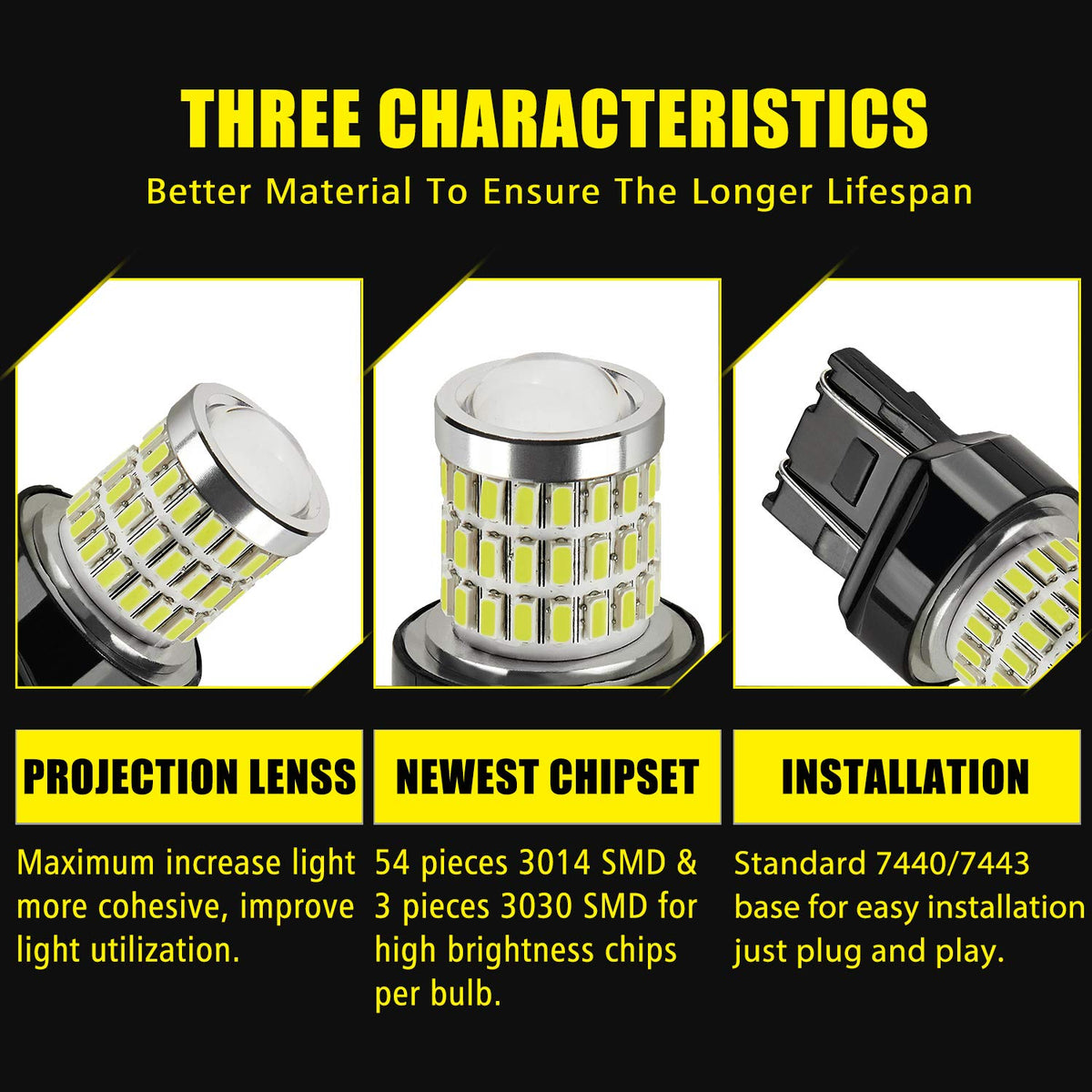 Q: What vehicles are compatible with AUXLIGHT 7440 7441 7443 7444 LED bulbs?A: The AUXLIGHT 7440 7441 7443 7444 LED bulbs are compatible with a wide range of vehicles that use sockets such as 7440, 7441, 7443, 7444, 7440A, 7443A, 992, T20, and W21W. It's important to check your vehicle's owner's manual or original bulb to confirm the correct bulb size before purchasing.