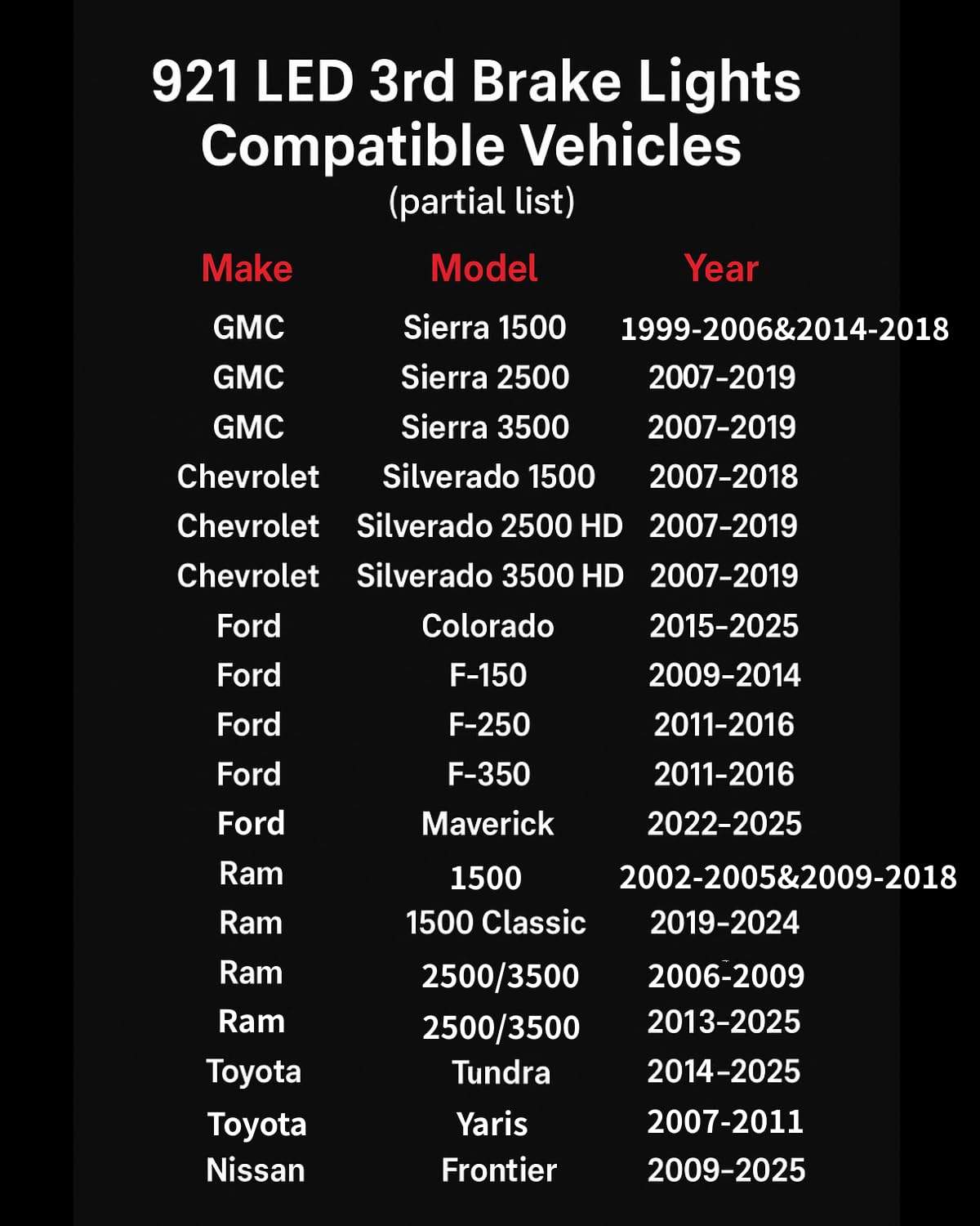 Q: Are LASFIT 921 LED bulbs compatible with the 2021 Ram 1500?A: No, LASFIT 921 LED bulbs are not compatible with the 2021 Ram 1500 3rd brake light. They are designed to fit a wide range of other vehicles, including Ram 1500, 2500, 3500, F150, Silverado, and more, provided the correct bulb size is used.