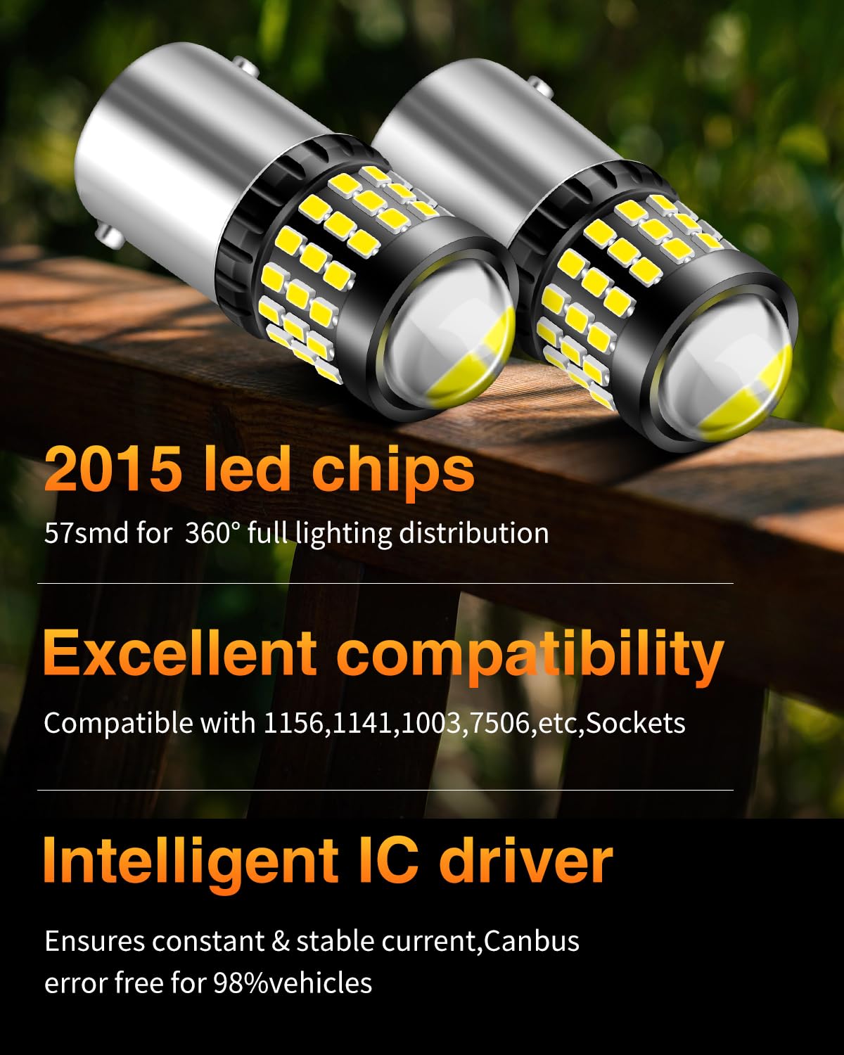 Product Specifications: Base Type: 1156 Operating Voltage: 9-30 Vdc Led Type: 2015 Led Quantity: 57 Leds Total Power Consumption: 3.5 Watts Luminous Flux: 1200Lm Type: Replacement Bulb Beam Angle: 360 Degree Replaces Stock Bulb: 1156 1156A 1156Na 87 97 97A 97Na 199 631 1073 1095 1141 1195 1295 2396 3497 5007 5008 7506 12088 1295Na Package Dimensions: 1.57'' X 0.59'' X 0.59'' Bulbs Are Shock And Vibration Proof Low Heat Generation Ensures A Longer Bulb Life Package Included: 2 X Led Bulbs Customer Service: ? 7*24 Hours Online Customer Service Need A Different Product? Just Search Luyed Along With Original Part / Model Number. Luyed Has The Answer To All Of Your Automotive Led Lighting Needs!