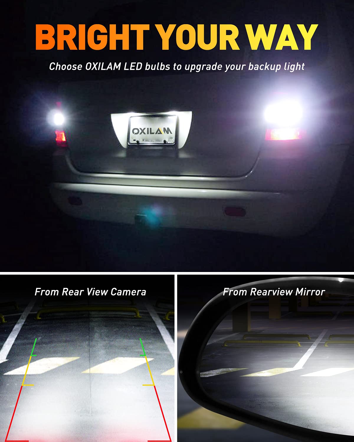 ?360°Shine?With 30pcs 3014 SMD distributed around the bulb body, plus 4pcs 3030 SMD high power LED chipsets on the top, the beam of this 921 LED reverse light is 360-degree, without any dark spots or shadow areas. A great choice to upgrade your backup light. | ?High Bright?Each OXILAM 921 LED bulb provides a luminous flux of up to 1,100 lumens and a color temperature of 6,000 Kelvin. 3 times brighter than halogen bulb, when you drive in reverse at night, these 921 LED bulbs will greatly improve your visibility by 300% and make driving safer. | ?Quick Installation?These 921 led backup light bulbs are made in high quality aluminum. Almost 1:1 same size as halogen bulbs, providing you with a hassle-free installation experience, and the entire installation process can be completed in just 5 minutes. | ?Long Lifespan?Thanks to the premium aluminum alloy shell and hollow inner body design of OXILAM 921 bulb, the heat can be dissipated efficiently, more than 40,000 hours lifespan ensures the bulb can continuous lighting. ONLY used for backup reverse lights. | ?98% Vehicles Compatible?Compatible with T15, 912, 921, 906, 904, 902, W16W sockets. Plug and play, non-polarity, directly fits into the vehicle’s socket, while some sensitive models may require an additional decoder to be installed. Note: This 921 bulb is not fit for Ram 1500 2500.