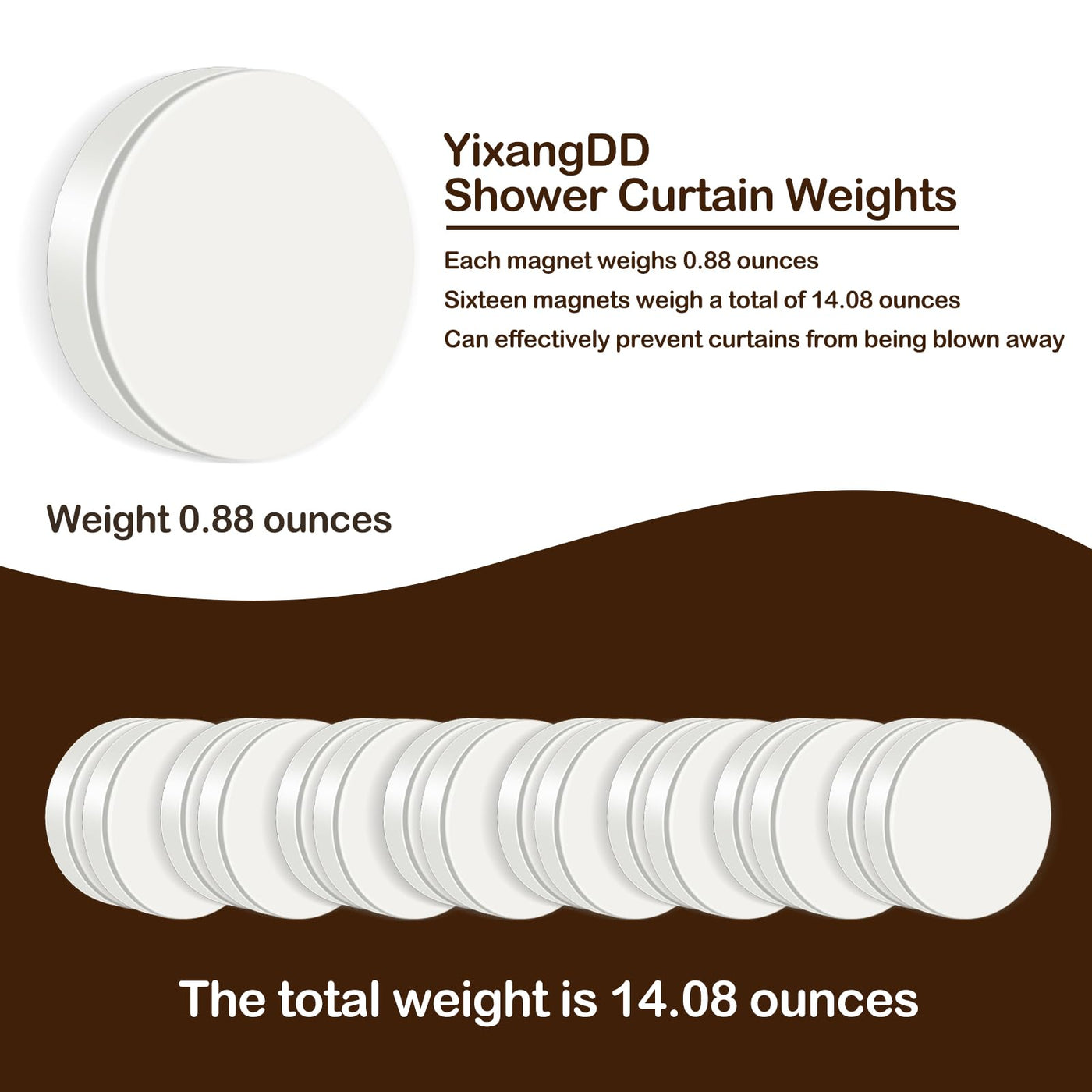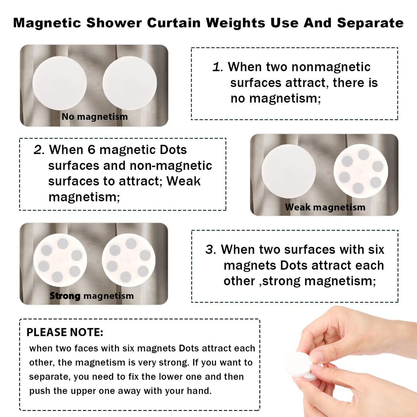 Q: How do these magnetic shower curtain weights work?A: The 16 Packs Magnetic Shower Curtain Weights feature strong round magnets that easily attach to the bottom of your shower curtain, helping to keep it weighted down and preventing it from blowing around in the breeze.