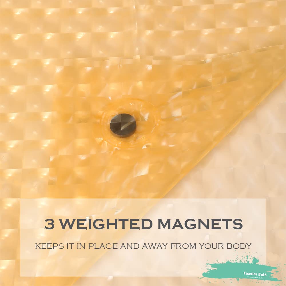 Q: What are the benefits of the weighted magnets in the liner?A: The weighted magnets at the bottom hem help keep the liner in place, preventing water from spilling onto your bathroom floor and reducing billowing during use.