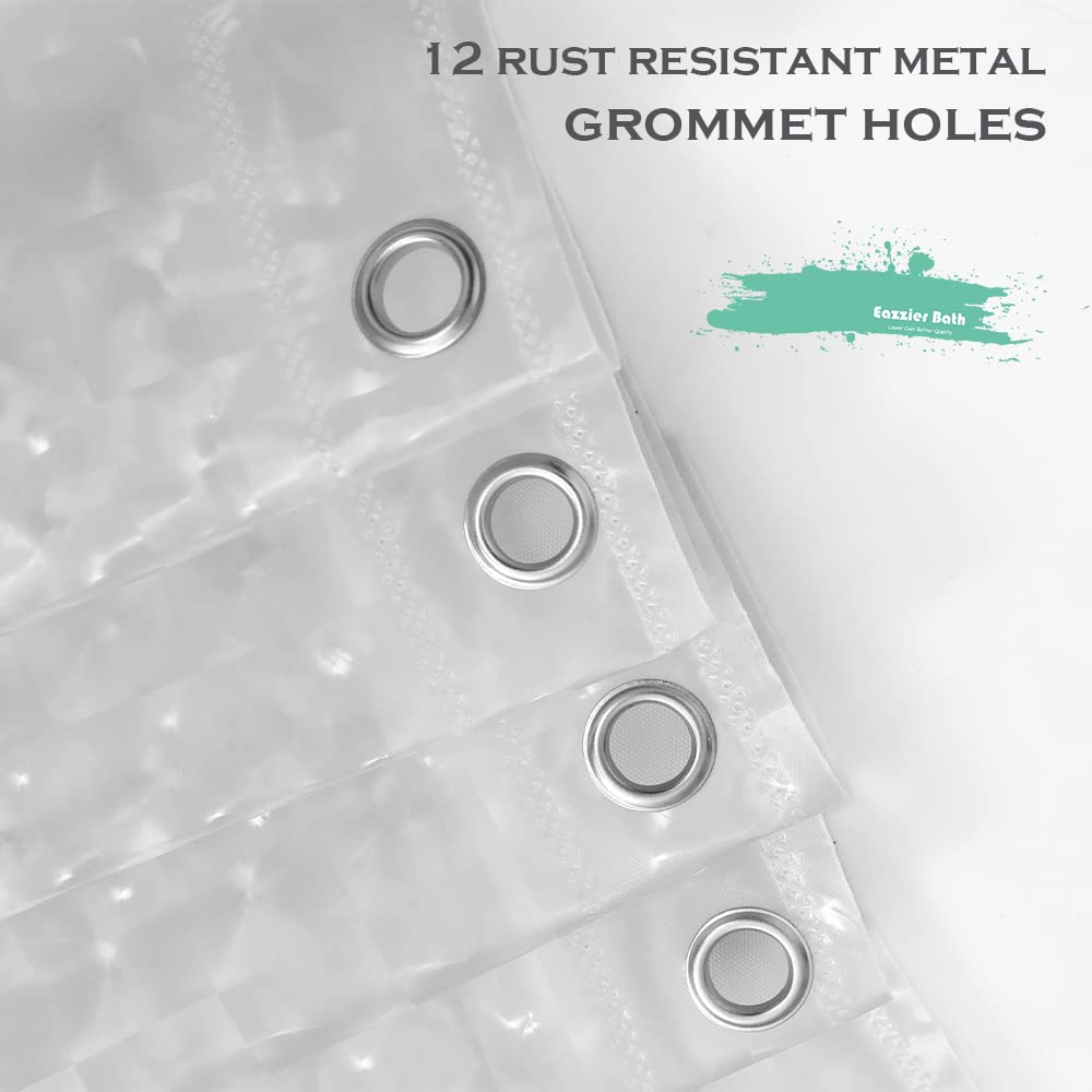 Q: What makes this shower curtain liner durable?A: The Eazzier Bath shower curtain liner features reinforced top headers with 12 rust-proof metal grommet holes, which prevent ripping and tearing, ensuring long-lasting quality.