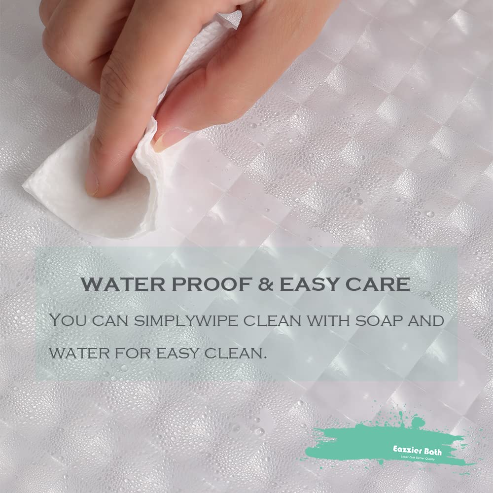 Q: How do I clean the Eazzier Bath shower curtain liner?A: Cleaning the Eazzier Bath shower curtain liner is simple; you can wipe it clean with soap and water, ensuring it stays fresh and hygienic.