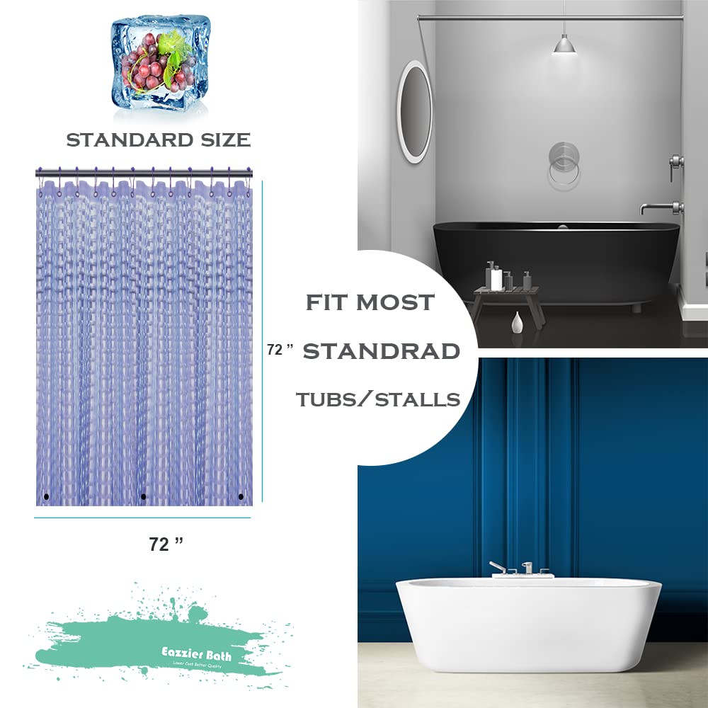 Q: What are the dimensions of the Eazzier Bath Shower Curtain Liner?A: The Eazzier Bath Shower Curtain Liner comes in a standard size of 72 inches by 72 inches, making it compatible with most standard bathtubs and showers.
