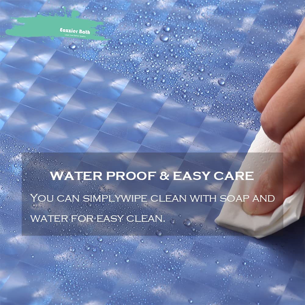 Q: Is the Eazzier Bath Navy Blue Shower Curtain Liner waterproof?A: Yes, the Eazzier Bath Navy Blue Shower Curtain Liner is made from 100% water-repellant material, ensuring that water rolls off quickly to keep your bathroom dry.