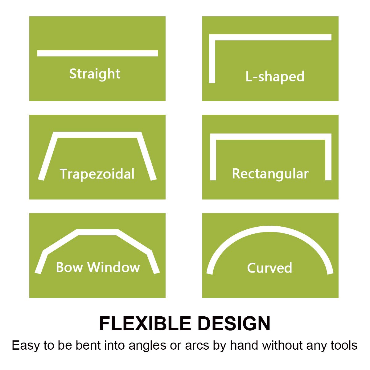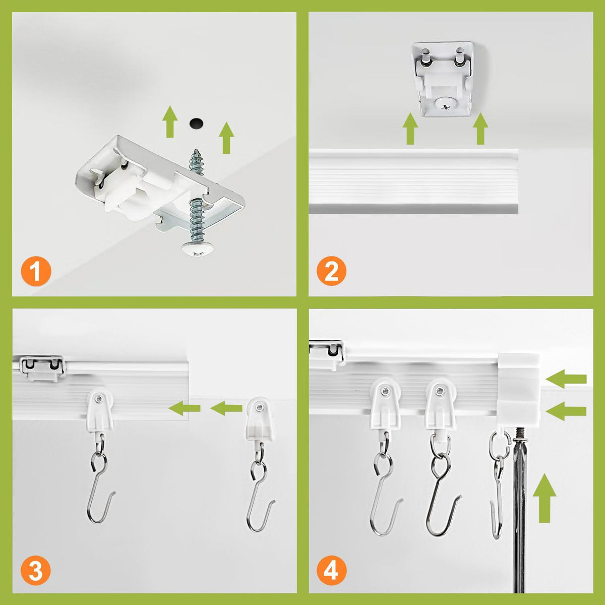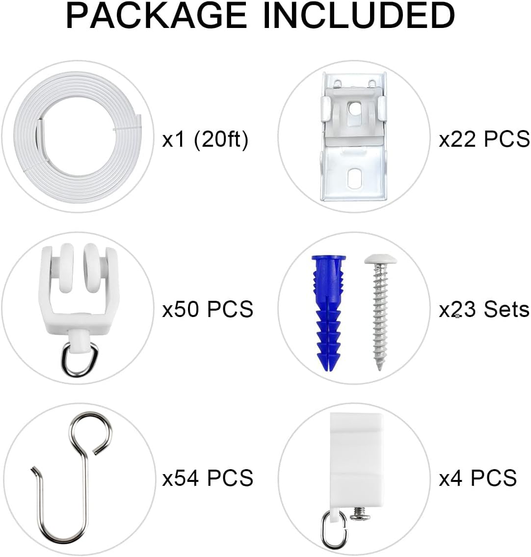This curtain track solves the need for curtains in special shapes, and can be used to hang indoor privacy curtains. We designed and customized the curtain hooks to make it easier to use this track.Compared with aluminum curtain track and long tension rods, this curtain track has a wider application and more cost-effectiveBasic Information: Material: PVC, Steel Dimension: Width-7/16”(10.6mm), Height-15/16”(23.6mm) Track Length: 20 ft Package Includes: 20ft Curtain Track 1 piece, Ceiling Mounting Brackets 22 pcs, Rollers 50 pcs, End Caps 4 pcs, Curtain Hooks 54 pcs, Screws and Anchors 23 sets We also provide accessories for our customers, please search for following ASIN if you need: Ceiling Mounting Accessory Set: B0832QXPJS, Wall Mounting Brackets: B0832Q36F7, Curtain Hooks: B085LXHJVS