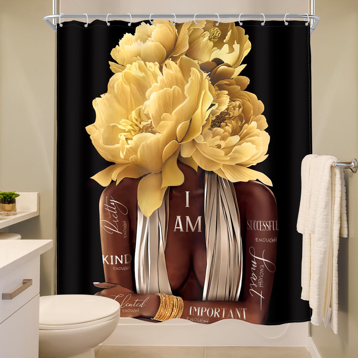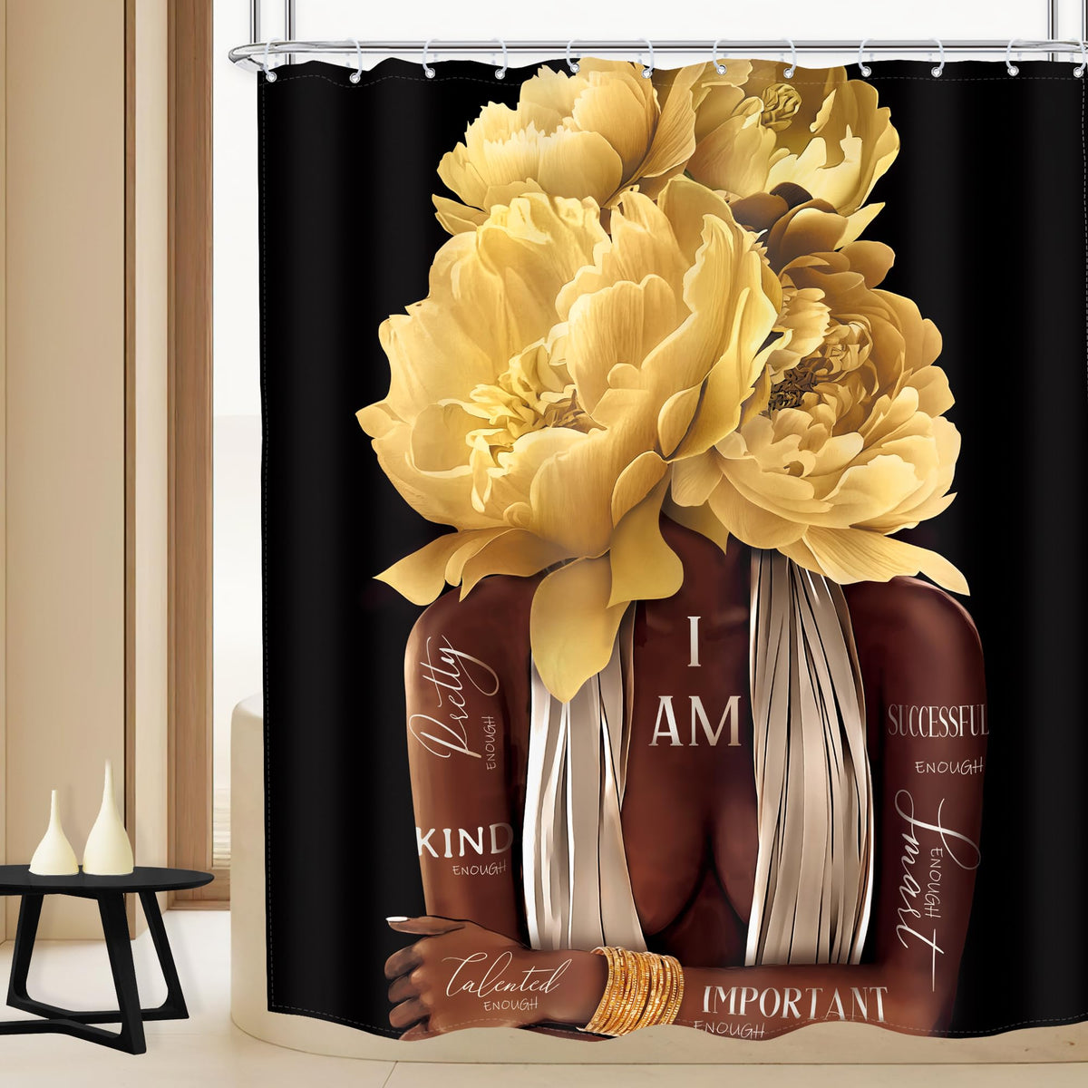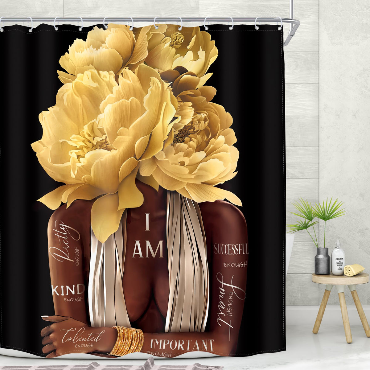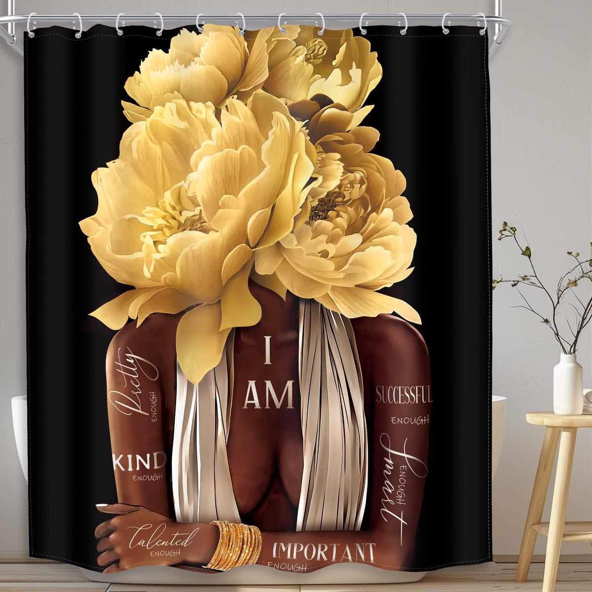 Meshelly African American Woman Shower Curtain 60Wx72H Black Girl Yellow Floral Rose Curtain For Bathroom Bathtub Motivational Quotes Bath Curtain Cloth Fabric Bathroom Accessories Decor With 12 Hooks