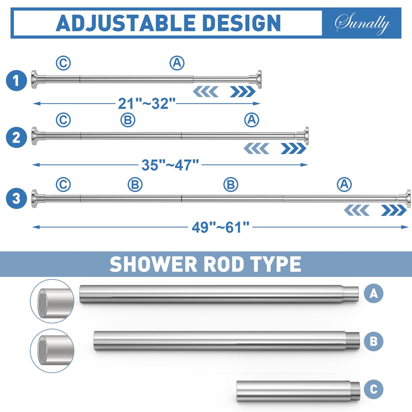 Q: What is the adjustable length range of the SUNALLY Shower Curtain Rod?A: The SUNALLY Shower Curtain Rod is adjustable and can extend from 32 inches to 61 inches, making it suitable for various bathroom or window sizes.