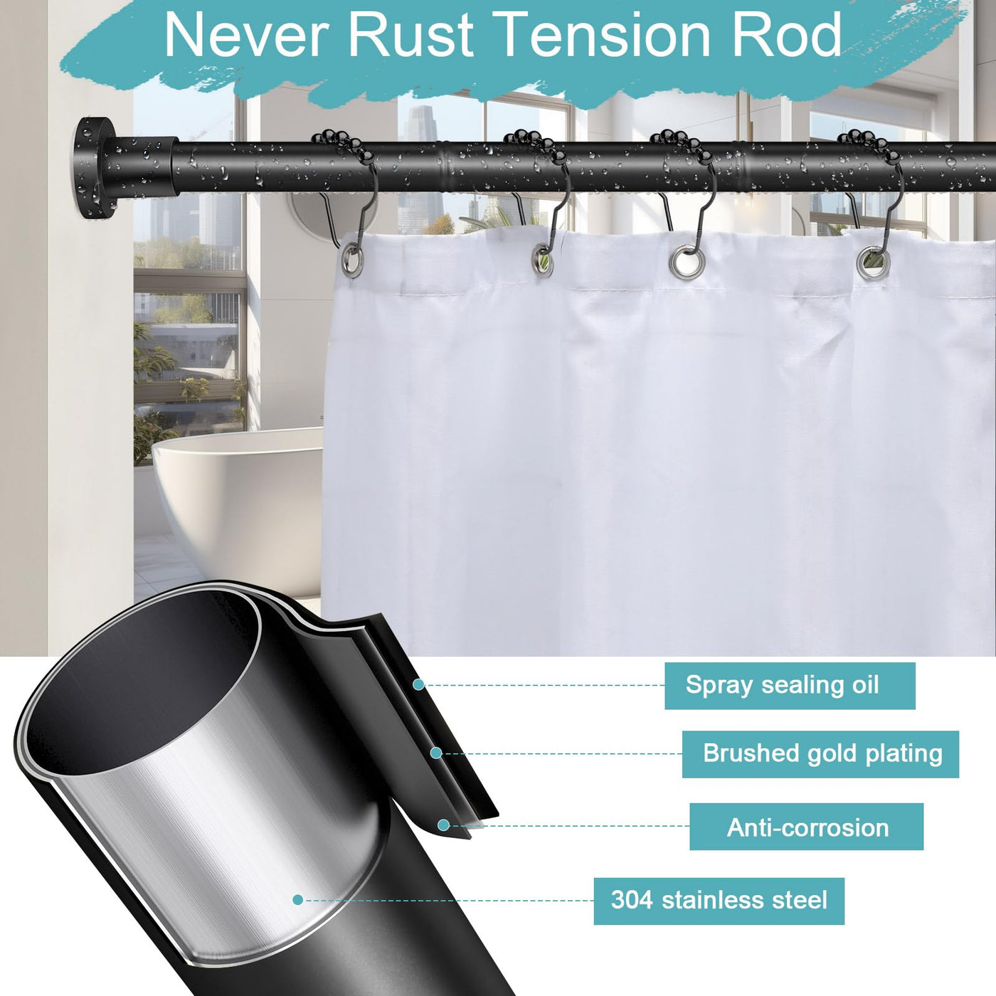 Q: What features prevent the curtain from slipping off the rod?A: The YNL shower curtain rod is equipped with premium non-slip rubber grippers and a high-pressure spring tension system, ensuring that the rod stays securely in place and prevents any slipping of the curtains.