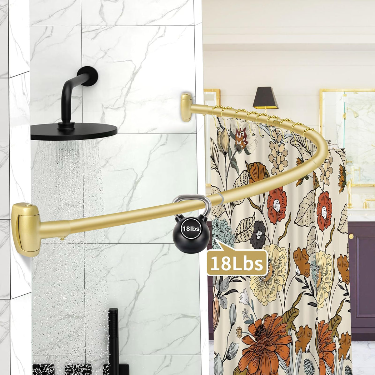 Q: What kind of weight can the YNL Curved Shower Curtain Rod support?A: This shower curtain rod can hold up to 18 pounds, thanks to its sturdy construction with a 0.9-mm-thick reinforced tube that ensures great weight capacity and durability.
