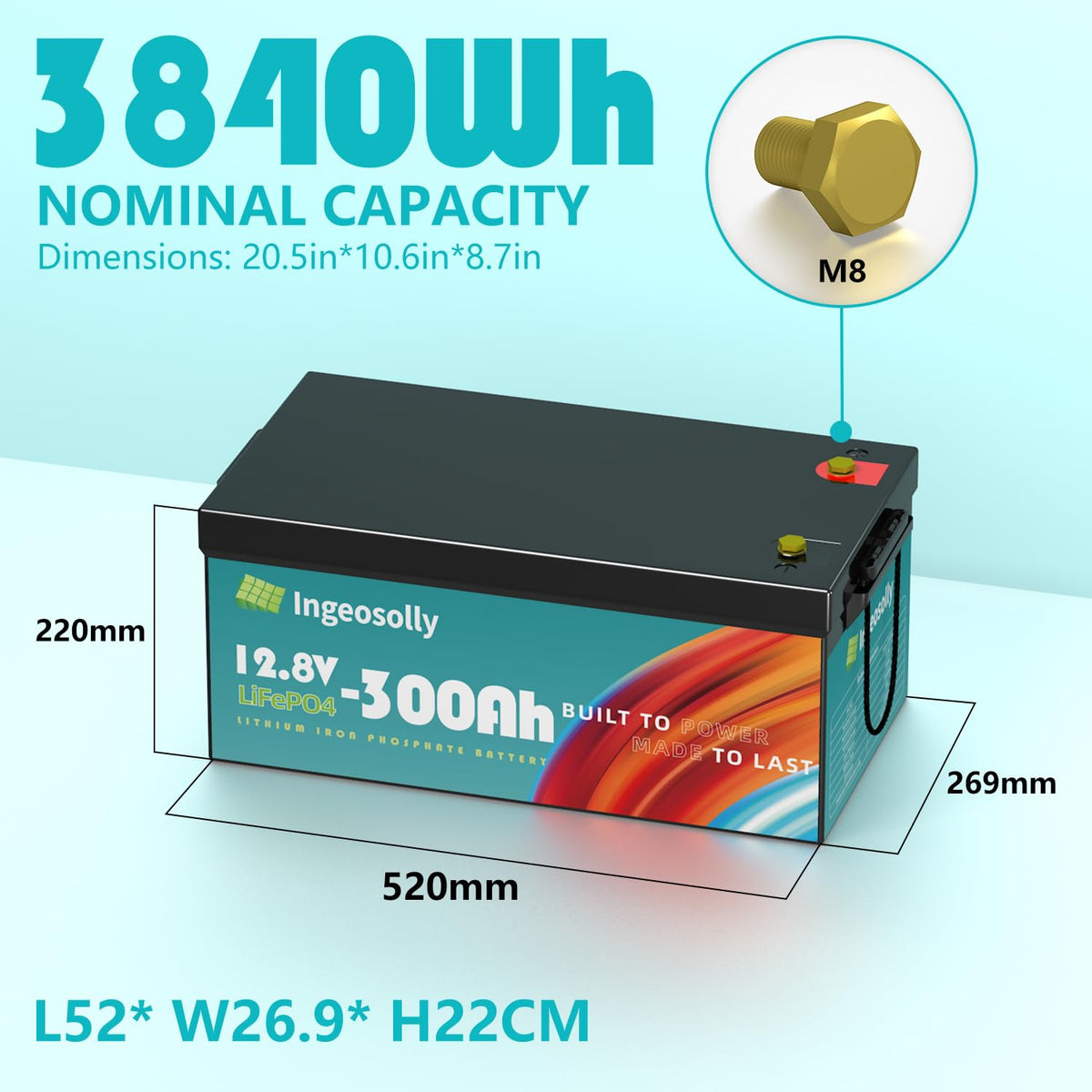 About Ingeosolly Deep Cycle LiFePO4 Battery Ingeosolly lithium iron phosphate batteries have excellent quality since they are manufactured by Automotive Grade LiFePO4 Cells with more stable performance, high energy density, and greater power. The BMS central system made of high-end chips can constantly monitor the battery status and perfectly protect your battery. Can be used for 10+ years. A great reliable green battery replacement widely used in RV, solar power system, off-grid application and fishing boat. Product Parameters Connection in Series/Parallel Up to 4 Batteries in Series=51.2V 300Ah Up to 4 Batteries in Parallel=12.8V 1200Ah Up to 4S x 4P Batteries= 51.2V 1200Ah Recommend Charger Type Support Lithium Battery Charging; Charging Voltage:14.2-14.6V; Charging Current: 20A-60A(0.2C). Charge/Discharge Charging Limit Voltage: 14.6V Over Voltage Disconnect: 14.8V Over Voltage Reconnect: 14.2V Under Voltage Warning: 11.6V Low Voltage Disconnect: 10.8V Low Voltage Reconnect: 12.4V Total Capacity: 300Ah Nominal Voltage: 12.8V Waterproof Grade: IP66 Operating Temperature Range Storage temperature: 10?-122? Charging state: 32 F ~ 113 F Discharge state: - 4 F~ 140 F Terminals: Removable M8 stud terminal