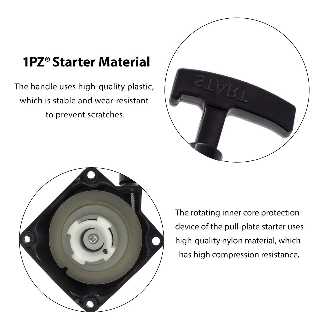 Q: What materials are used in the construction of the 1PZ pull start?A: The 1PZ MOT-P01 Recoil Pull Start is made from high-quality components designed for durability and extended lifetime, ensuring reliable performance for your gas scooter or dirt bike.