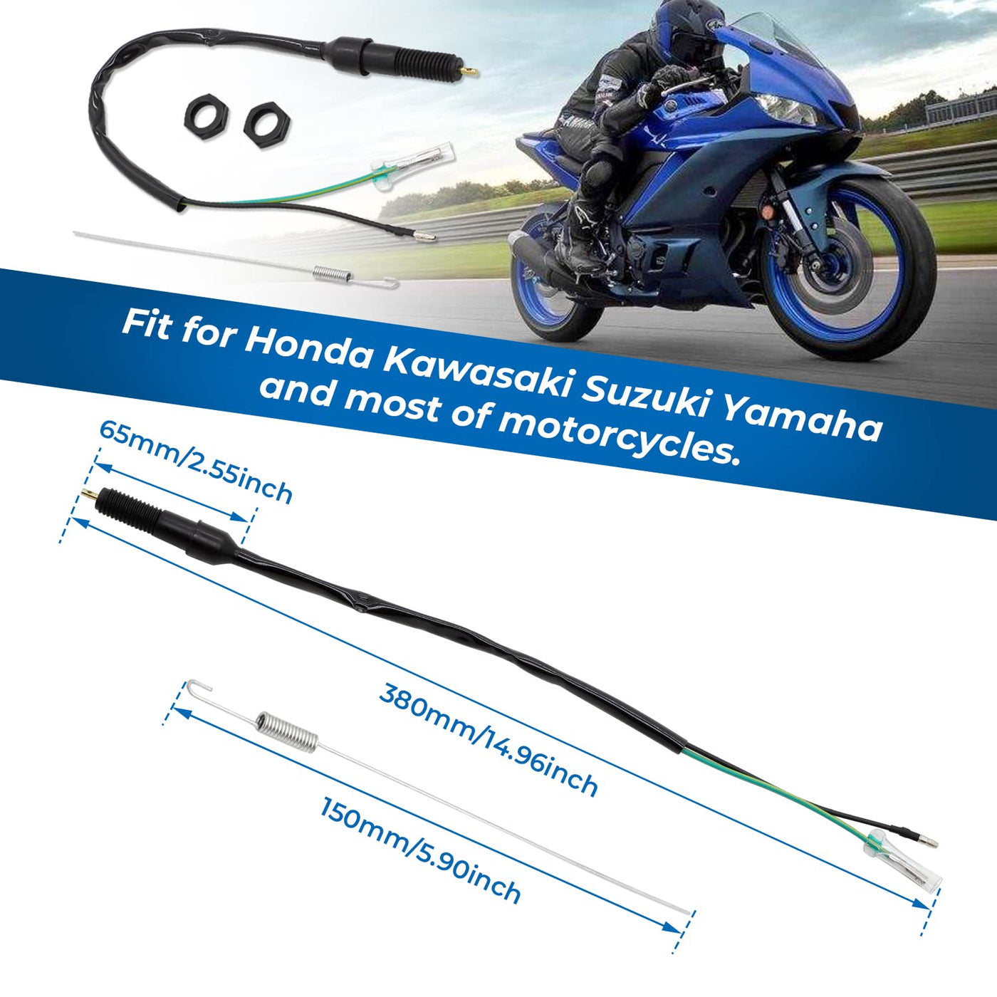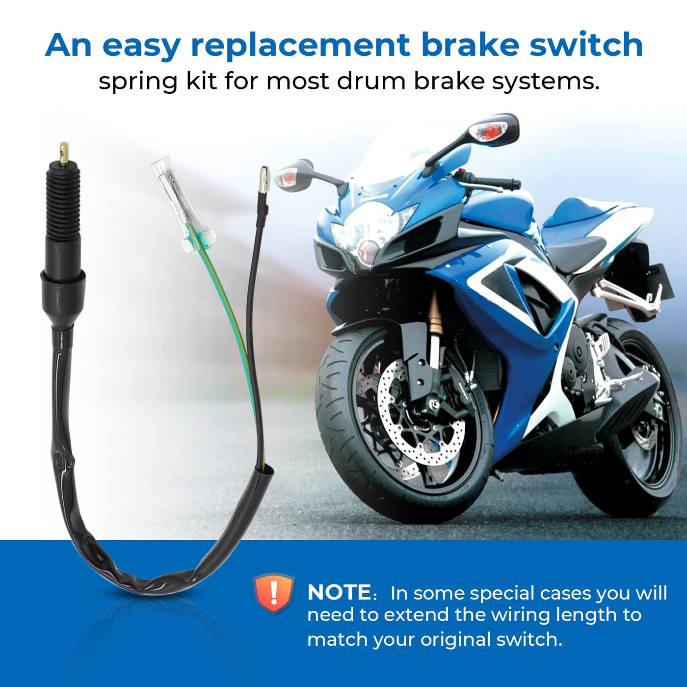 Features: For use with most drum brake systems Easy to install, no instructions required An easy replacement brake switch spring kit for most drum brake systems. Supplied with a 150mm spring that can be cut down to size. Designed with an extra small and yet effective spring; you really can cut our brake spring to size. A direct replacement for most brake pedal switches: Normally Open Switch: When this switch is in its normal rest position the contact is open - the circuit is ''off'' Pulling on the switch via the metal spring hole closes the contact - the circuit is ''on''. Fitments: Universal For Honda Kawasaki Suzuki Yamaha and most of motorcycles Package: 1 x Rear Brake Light Switch 1 x Spring Aftermarket Rear Brake Stop Switch, that fits most bikes that use a two / 2 wire system, and a switch that snaps into the frame. In some special cases you will need to extend the wiring length to match your original switch, but at the price of these vs an OEM switch, it's well worth your time!