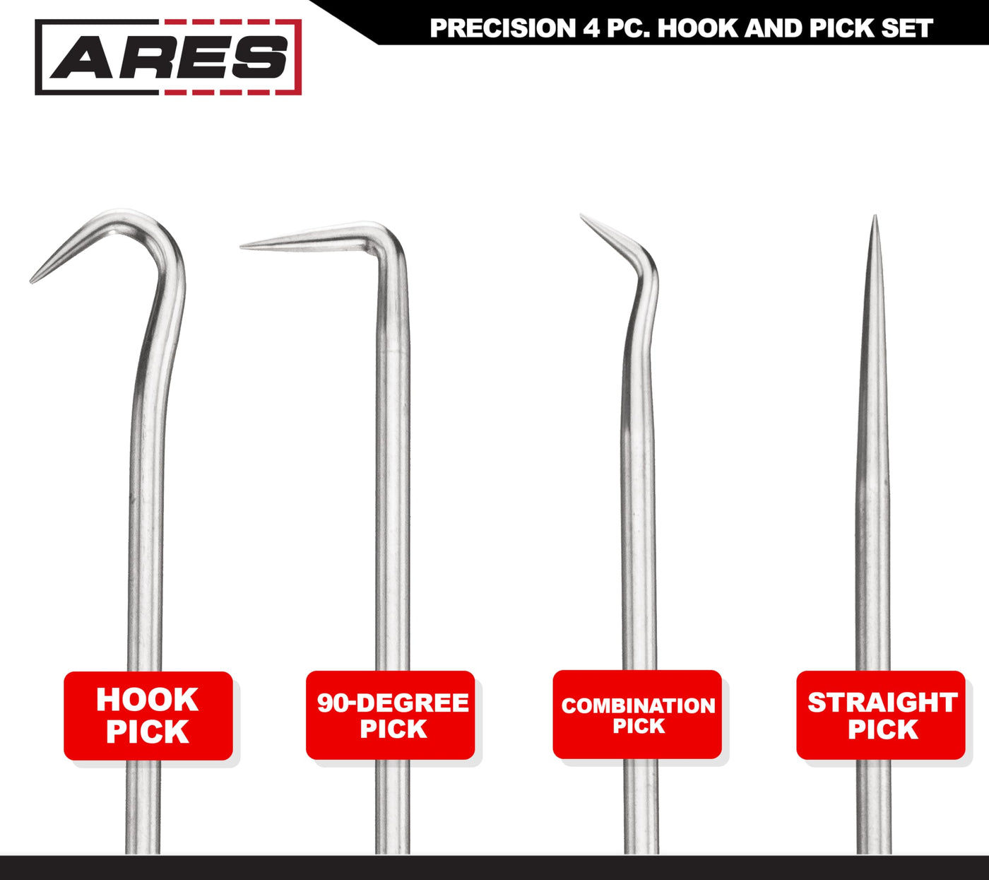 ARES 70256 - Precision Hook and Pick Set - 4-Piece Set Includes Precision 90 Degree, Hook, Combination and Straight Hooks and Pi