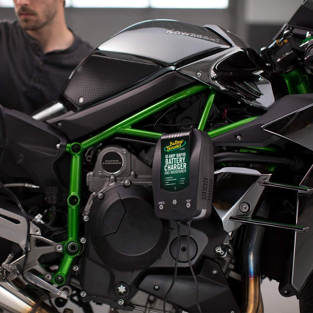 Q: What battery types are compatible with the Battery Tender 10 AMP charger?A: The Battery Tender 10 AMP charger is compatible with various battery chemistries, including flooded, AGM, gel, and lithium (LiFePO4). This versatility makes it suitable for a wide range of vehicles such as cars, trucks, SUVs, motorcycles, and RVs.