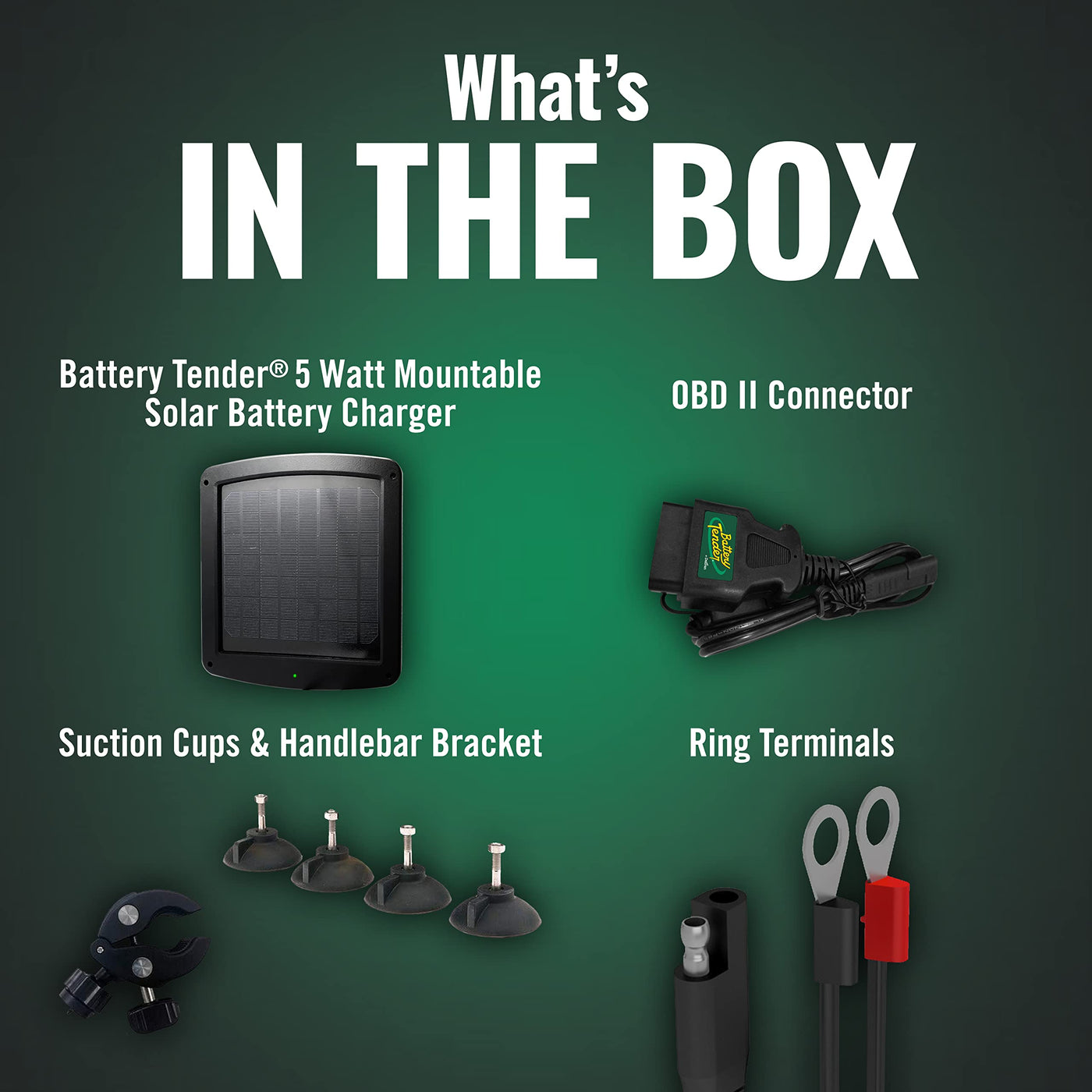 Q: What is included with the Battery Tender 5 Watt Solar Panel?A: The complete package includes the solar panel, 4 suction cups for mounting, a handlebar bracket, an OBD II plug, battery ring terminal cable, an 8 ft output cord, an 18" AC power adapter charging cable, as well as a 5-year warranty and lifetime customer support.