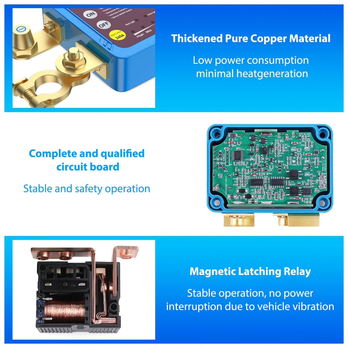 Specifications: Voltage Rating: 12V Current Rating: 240A Instantaneous Current: 500A Standby Current: 0.003A Power Loss Delay Disconnects For 120 Seconds Operating Temperature: 30?-90 ?