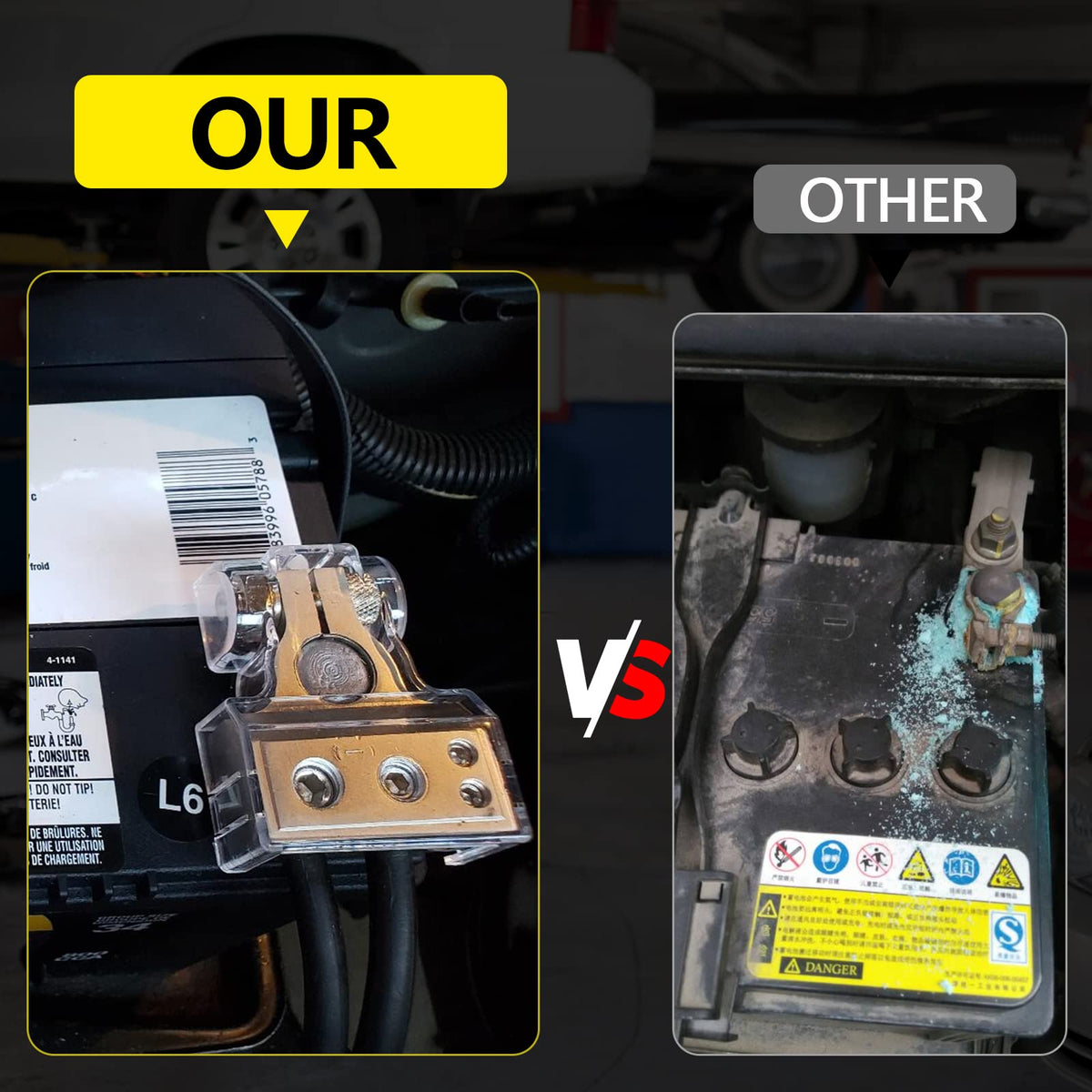 Features: Universal Battery Terminal Comes With A Positive Or Negative Adapter. 0/4/8/10 Gauge Inputs. Gold Screws Terminals Hold Cables Securely In Place. Durable: Good Workmanship, Strong Conductivity, Heavy Lead Content Is High, Accounting For 82% Of The Value. Universal Fit: The Positive Negative Battery Terminal Clamp Is Suitable For Most Models Battery, Easy To Replace, Fast Installation, Good Conductivity. Enhance Your Car'S Under-Bonnet Appearance, Or Complete Your In-Car Stereo Installation. Ideal For Advanced Audio Technology, Heavy-Load Lighting Or Power Inverter Charging Systems, Heavy-Duty And Commercial Use.