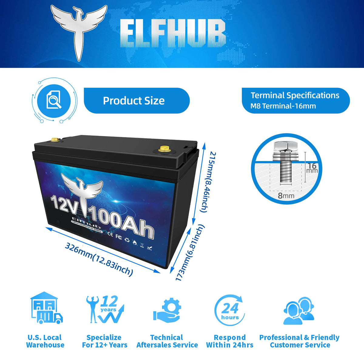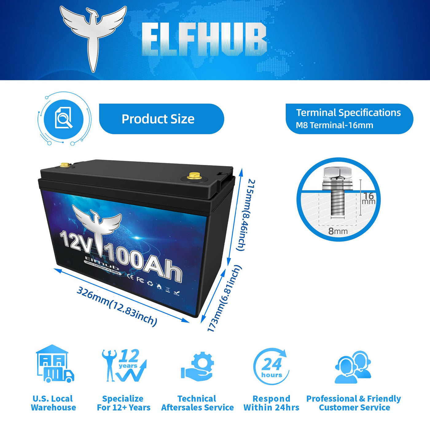 Elfhub 12V 100Ah Lifepo4 Lithium Battery, Upgraded 100A Bms, 10-Year Lifespan With Up To 15000 Cycles, Max. 1280Wh Energy,Perfect For Rv, Solar, Trolling Motor