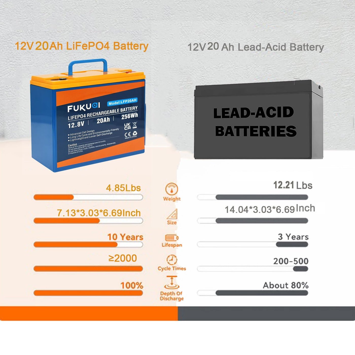 Q: What are the benefits of using the Fukuai 12V 20Ah LiFePO4 Lithium Battery?A: The Fukuai 12V 20Ah LiFePO4 Lithium Battery offers superior performance with high energy density, long cycle life, and outstanding safety features. It provides over 2000 deep cycles, significantly more than traditional lead-acid batteries, and has a built-in BMS protection system to safeguard against overcharging and short circuits.