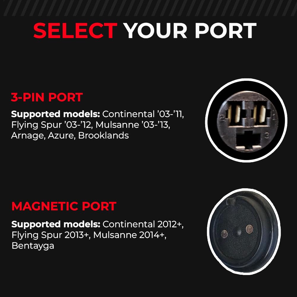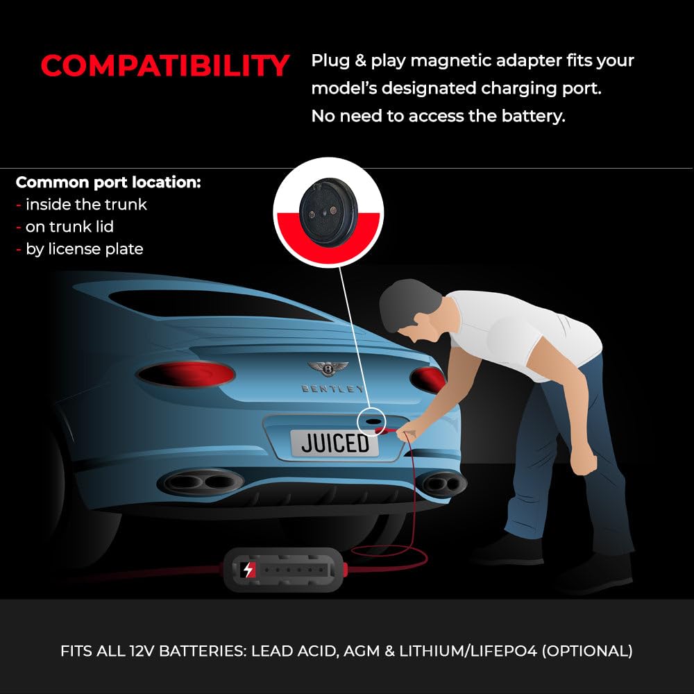 Fits Like Oem, Performs Much Better Automatically Charge And Repair Your Bentley'S Battery, While Protecting Your Car’S Electronics. Guaranteed To Fit Your Model’S Designated Charging Port With The Included Magnetic Plug & Play Adapter For Bentley. Common Port Location: Above Rear License Plate. *Use The Included Alligator Clamps Or 12V Cig Adapter To Charge Any Vehicle With A 12 V Battery. Supported 12V Batteries: Lithium/Lifepo4, Agm, Lead Acid, Wet, Gel, Efb, Mf & Calcium.