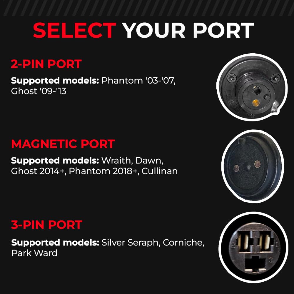 Q: Is the JMR Battery Charger compatible with all Rolls-Royce models?A: The JMR Battery Charger is specifically designed to be compatible with Rolls-Royce Phantom models from 2017 and older, as well as Ghost models from 2013 and older. It comes with a 2-pin plug and play adapter that fits these models' designated charging ports.