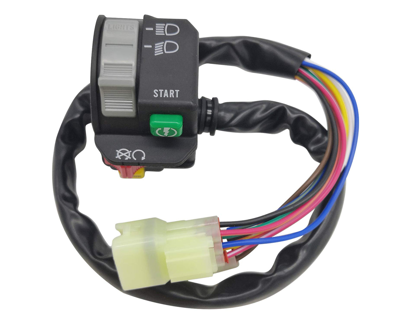 Q: What functions does this handlebar control switch provide?A: This control switch allows you to easily manage multiple functions: it includes switches for engine start, engine stop, headlight high/low, and reverse.