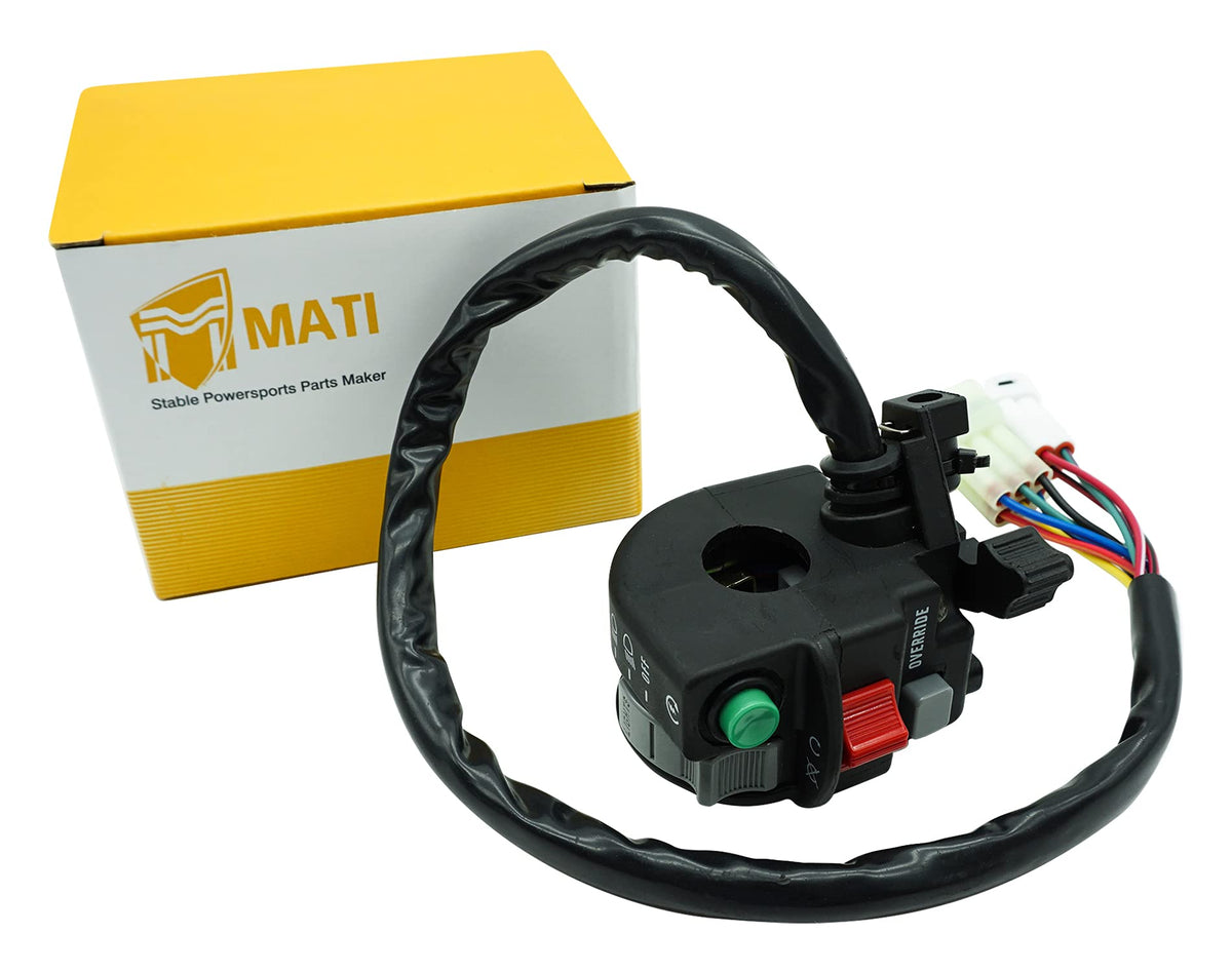 Q: What functions does the M MATI Left Handlebar Switch provide?A: This handlebar switch provides multiple functions including Engine Start, Engine Run Stop, Headlight Hi Lo Off, Override, and a Choke Lever, making it a versatile replacement part for your ATV.