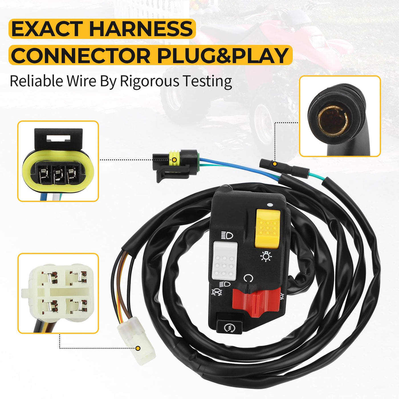 Q: How does this switch compare to other ATV handlebar switches in terms of quality?A: The M MATI Left Handlebar Switch is manufactured to OEM specifications and is rigorously tested for durability, featuring a long-lasting spring and reliable wiring, making it a quality choice among ATV handlebar switches.