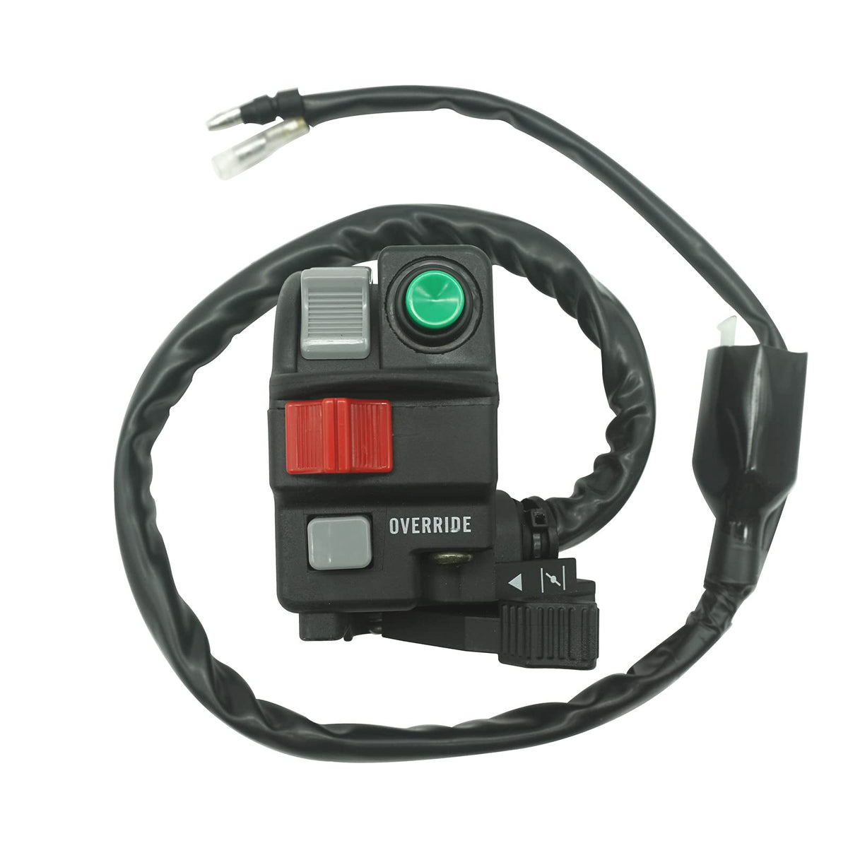 Q: What functions does this handlebar switch perform?A: This handlebar switch allows you to switch the engine start, run, and stop functions. It also controls the headlight settings (Hi, Lo, Off), features an override switch, and includes a choke lever.