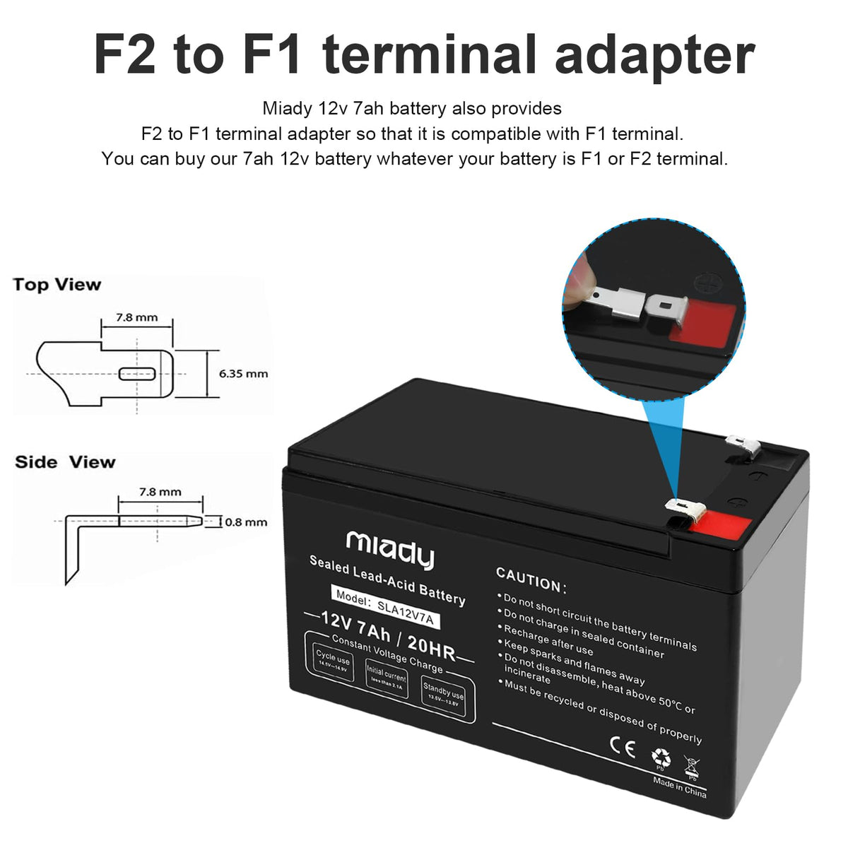 Q: What precautions should I take when using this battery?A: When using the Miady 12V 7Ah battery, avoid short-circuiting, using organic solvents for cleaning, and mixing with batteries of different types. For safety, use a charger with short circuit and overcharge protection, especially in vibration-prone conditions.