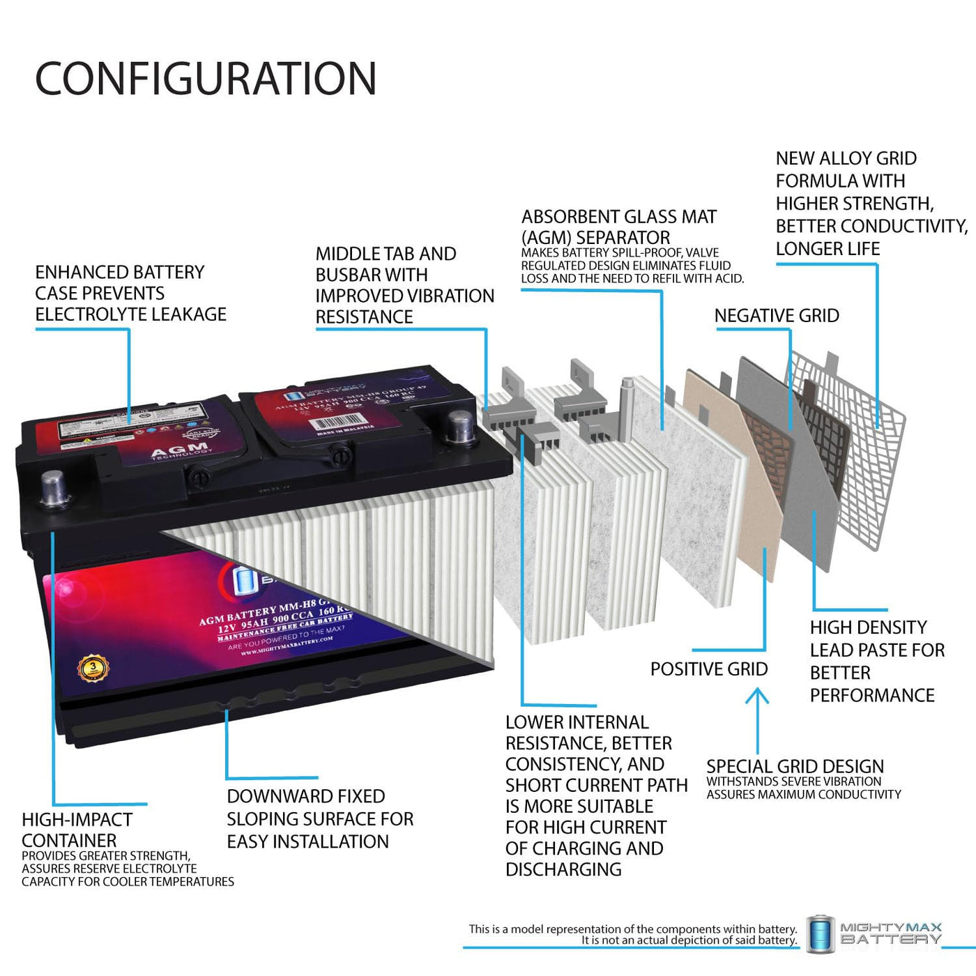 Mighty Max Battery MM-H8 Start and Stop Car BCI Group 49 12V 95Ah, 160RC, 900 CCA Rechargeable AGM Car Battery