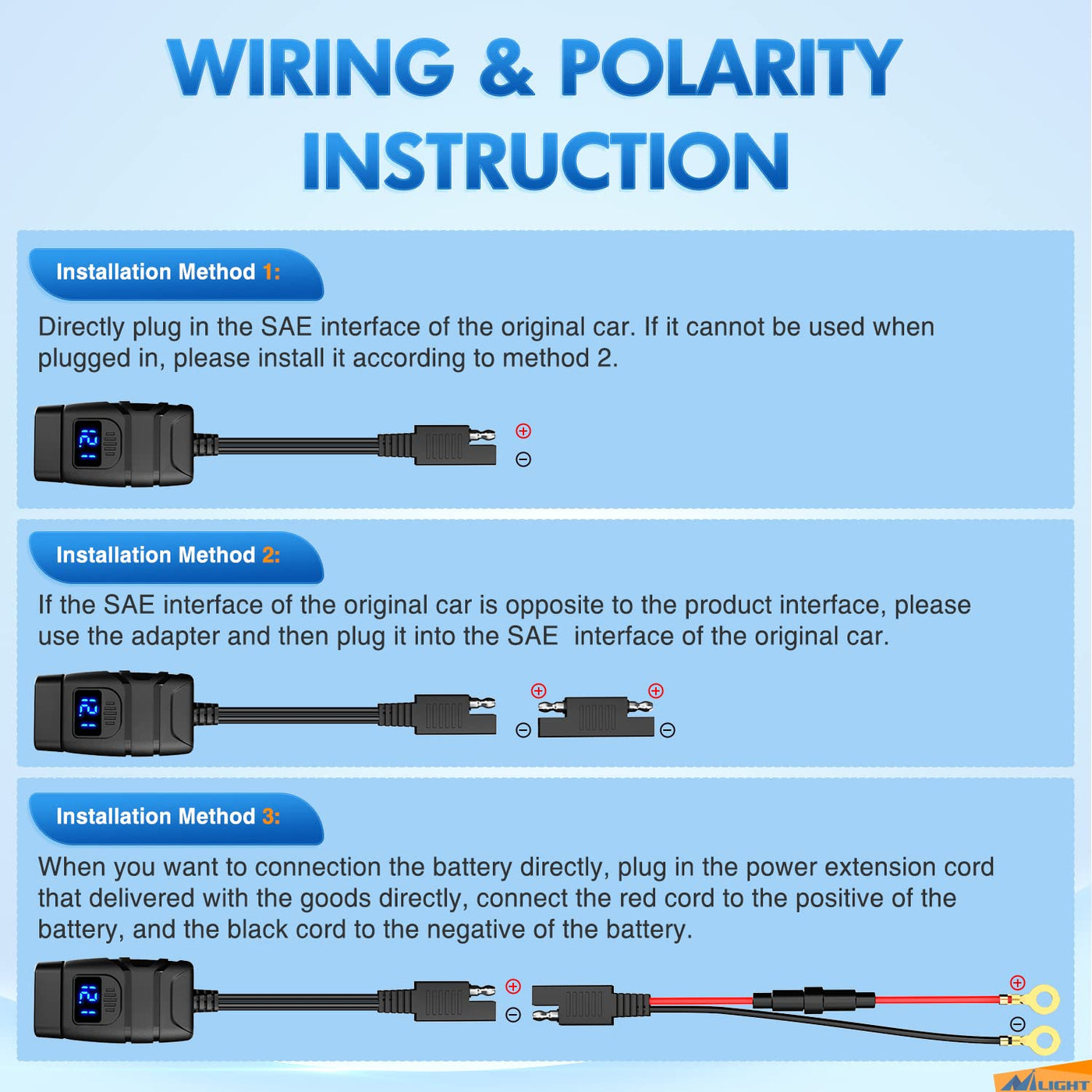 Nilight Motorcycle Handle Bar Chargerfeatures:1.Qc3.0 Dual Usb Charger: 5V/3.4A, 9V/2.5A, 12V/2A2.Led Voltmeter: 6-30V3. Independent Power On-Off Switch4. Sae Cable5. Waterproof Captwo Mounting Options:A.Install To Any 7/8 Inch Handlebar With The O Shape Mounting Bracket.B. Mount With Pad Bracket And Screws, It Can Be Mounted To Almost Any Surfacetwo Power Methods:A. Connected Directly To The Battery With The Original Sae Interfaceb. Connected To The Battery With The Sae To O Ring Harnesswire Length:A. From The Pigtail Of The Item To The End Of The Sae Receptacle: 42.5 Inches)B.Sae To O Ring Wiring Harness: 4.53 Inches.Compared To The Normal Usb Socket, Nilight Qc3.0 Usb Charger Can Charge Compatible Devices To 90% In 35 Minutes, Which Is Faster And More Convenient.Note:If The Voltage Is Lower Than 12V, Please Replace Your Battery As Soon As Possible When Starting The Car Engine.