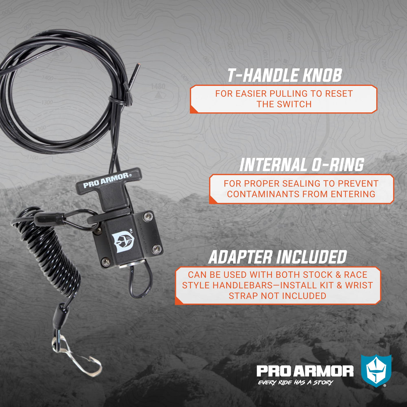 Pro Armor Kill Switch Features A T Handle Knob For Easier Pulling To Reset The Switch And An Internal O-Ring For Proper Sealing To Prevent Contaminants From Entering The Main Body. Universal Design Works With Any Atv. The Durable Plastic Housing Allows For Years Of Abuse. Included Adapter Allows You To Use This With Both Stock And Race Style Handlebars. Kill Switch Install Kit And Wrist Strap Sold Separately.