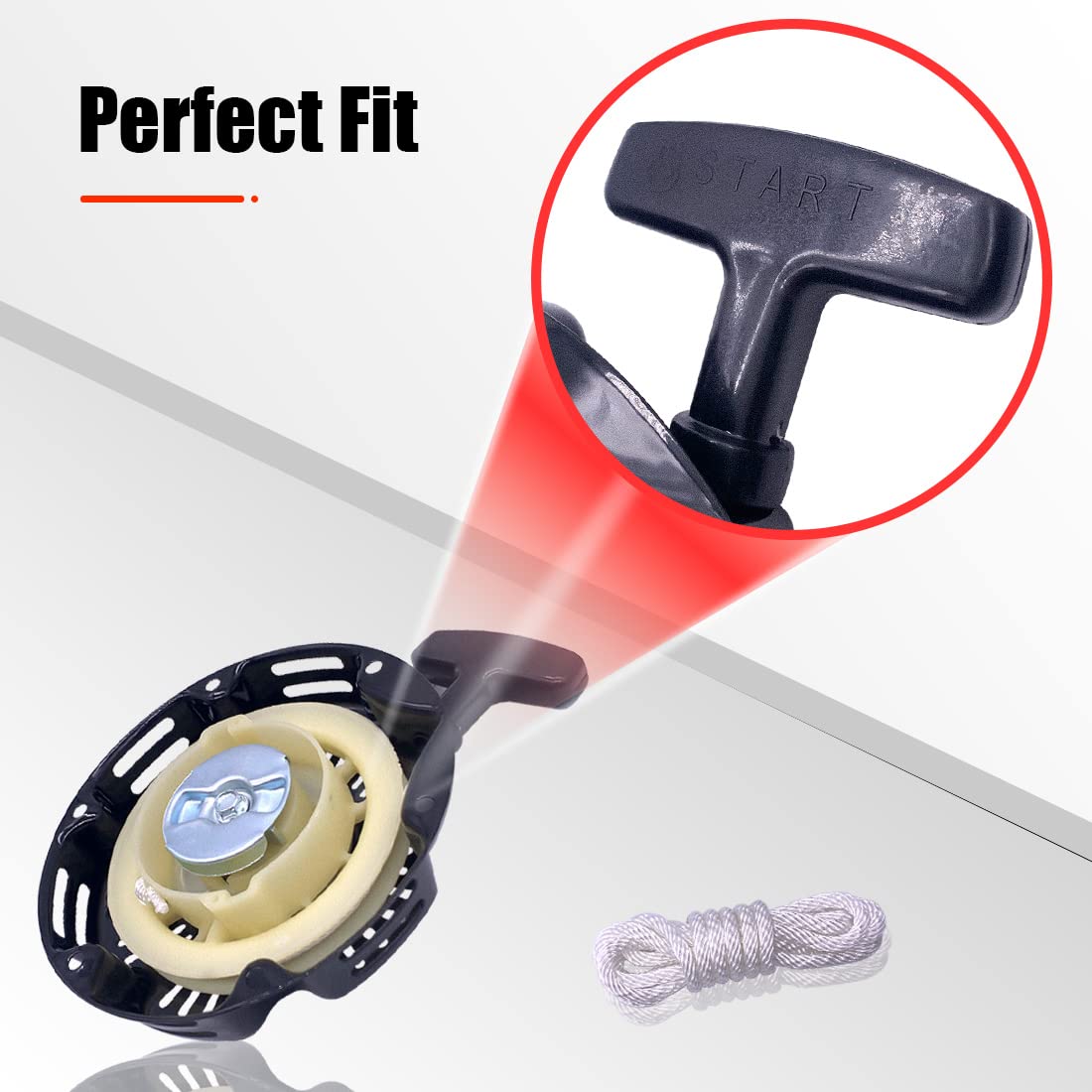 Q: What does the package include when purchasing this recoil starter?A: The package includes one Pull Start Recoil Starter, one spark plug, six bolts, and one cable pulling, providing everything you need for installation.